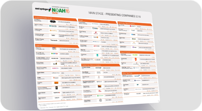 MAIN STAGE - PRESENTING COMPANIES 2016 Home Automation & IoT Retail Technology, Media & Gaming Niall Murphy IoT smart products platform Susanne Zacke Online auction platform Thomas Ebeling TV network Founder & CEO Member of the Board CEO E: 50 | CR: $15m raised E: 120 | Rev 2014: $41m | CR: $96m raised E: 5,000 | Rev 2015: $3.6bn | EV: $12.7bn* Ludovic Le Moan Cellular network for connected objects Tim Stracke Internet marketplace for luxury watches Eric Léandri Search engine CEO Co-CEO President & Co-Founder E: 205 | CR: $151m raised E: 85 | CR: $23m raised CR: $28m raised Andreas Rudyk IoT products for home & businesses Niklas Östberg Restaurant delivery marketplace Peter Würtenberger Samsung-exclusive news service Co-Founder CEO CEO E: 50 | CR: $10m raised E: 3,000 | Rev 2015: $221m | EV: $3.1bn Christian Deilmann Thermostats and apps for homes & Dr. Philipp Kreibohm Online furniture store Christian Sauer Real-time web analytics solutions Co-Founder & MD businesses Co-Founder CEO E: 130 | CR: $57m raised E: 1,383 | Rev 2014: $131m | EV: $960m E: 250 | Rev 2013: ~ $11m | CR: $35m raised Philipp A. Pausder Heat solutions provider Dr. Oliver Lederle Toys retailer Hanna Aase Video social networking site Founder & MD Founder & CEO CEO E: 220 | CR: $37m E: 1,500 | Rev 2015: $560m E: 5 Oliver Samwer Builder of consumer Internet companies Hermione Mckee Free-to-play mobile games developer Mobility Founder & CEO Head of Finance Hakan Koç E: 36,000 | Rev 2015: $142m | EV: $2.6bn* E: 300 | CR: $32m raised Co-Founder & CEO Pan-European used car market maker Thierry Petit Online website for shoping & cosmetics E: 1,800 | EV: $1.1bn Co-Founder & Co-CEO Travel & Tourism E: 830 | Rev 2015: $496m | EV: $659m* Jochen Engert Nicolas Brusson Car sharing website Philip Rooke European bus mobility provider Co-Founder & COO CEO Online platform for print-on-demand apparel Founder & Managing Director E: 500 | EV: $1.5bn E: 1,000 Dr. Dieter Zetsche - Chairman E: 500 | Rev 2015: $96m | CR: $13m raised Johannes Reck of the Board of Management Automotive manufacturer Rubin Ritter - Member of the CEO Online booking platform for tours & activities Management Board Online fashion retailer E: 284,015 | Rev 2015: $ 113.7bn | EV: $61.4bn* E: 250 | CR: $96m raised Shahar Waiser On-demand transportation, delivery & E: 10,000 | Rev 2015: $3.28bn | EV: $7.6bn* Hugo Burge Founder & CEO logistics CEO Travel metasearch engine E: 700 | EV: $1-2bn | CR: $520m Technology, Media & Gaming E: 300 | Rev 2016E: $116m | CR: $128m raised Daniel Charles Ishag Cab comparison website Dr. Mathias Döpfner Media corporation Glenn Fogel - Head of Internet travel and services Founder & CEO CEO Worldwide Strategy & Planning E: 200 | CR: $250m raised E: 150,023 | Rev 2015: $3.65bn | EV: $7.6bn* E: 16,000 | Rev 2015: $9.22bn | EV: $64.8bn* Simone Menne Airline Henry Blodget News site CFO CEO, Editor-In-Chief NOAH Top Picks E: 120,000 | Rev 2015: $35.5bn | EV: $9.2bn* E: 250 | EV: $450m Nir Erez Jonas Drueppel Henrik Herr - Head Germany & Global financial services Mobile app for public transportation tracking CEO Viral sound messaging app Austria Intl. Wealth Management Founder & CEO E: 48,200 | Rev 2015: $20,087m | EV: $26.1bn* E: 85 | CR: $82m raised CR: $6m raised Greg Ellis Nora-Vanessa Wohlert, Susann Rudolph W. Giuliani Transactional law firm CEO Real estate and cars classifieds Hoffmann - Founders & MD Digital house for business women Shareholder E: 1,120 | Rev 2015: $436m | EV: $4.8bn* E: 14 E: 3,750 Christian Vollmann Klaas Kersting Clark Parsons Internet think tank Angel Investor & Entrepreneur Car manufacturer Founder & CEO Mobile game publisher and developer CEO E: 70 | Rev 2015: $112m | CR: $23m raised Harold Goddijn Polina Montano Karel Dörner Global management consulting firm CEO Digital mapping and routing Co-Founder & COO Mobile app for job applications Partner E: 4,600 | Rev 2015: $1.1bn | EV: $1.9bn* E: 50 | CR: $10m raised E: 17,000 | Rev 2014: $8.3bn Travis Kalanick Lucas von Cranach Michael Gross Space, community and services for business CEO Online transportation network Founder & CEO Global football community Vice Chairman E: 6,700 | Rev 2015: ~$1.5bn | EV: $62.5bn E: 80 | CR: $20m raised E: 1,000 | Rev 2015: $260m | EV: $16bn Carlos Watson News website Note: All private company valuations are based on public news Founder & CEO * Public company E: 15 | CR: $25m raised E – Employees / Rev - Revenues / CR – Capital Raised / FS - Funds 10