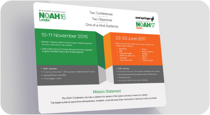 Two Conferences Two Objectives One-of-a-Kind Audience 10-11 November 2016 22-23 June 2017 • Number 1 industry event for the European Internet ecosystem • Platform for discussing disruptive Internet-related trends for senior executives to do business across 10 key industries: • Connecting leading and mature European Internet companies • Advertising • Fintech to global financial investors and strategic partners • B2B • Media, Telecom & • Consumer Goods Gaming • Healthcare, Science & • Mobility Education • Retail • Home Automation • Travel & Tourism • 2,500+ attendees • 3,500+ attendees • C-level executives of over 1,000 corporate and financial Internet investors • C-level executives of over 1,000 corporate and financial Internet investors • Leading B2B service providers • Senior executives and decision makers across all industry sectors • Old Billingsgate, London • Tempodrom, Berlin • Co-hosted by NOAH Advisors and Axel Springer Mission Statement The NOAH Conference provides a platform for leaders of the digital economy to meet and interact. The target audience spans from entrepreneurs, investors, corporate executives, networkers to leading industry journalists. 2