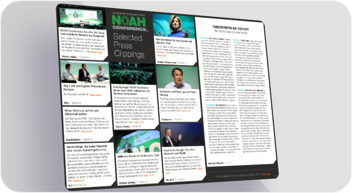 ® NOAH Conference brachte FinTechs Foto: Gregor Fischer / dpa und etablierte Banken ins Gespräch Selected Eine Konferenz für die Gründer der Das digitale Ökosystem ist der Schlüssel. In digitalen Welt diesem Punkt war sich die Finanzwelt auf Press Auf der Start-up-Konferenz Noah im Tem- der NOAH Conference, einer der europaweit podrom berät die IT-Szene über die Zukunft wichtigsten Konferenzen für Entscheider aus Europas. Gründergeist trifft dabei auf Kapital. der digitalen Wirtschaft, einig. Read more Clippings Read more Startup Valley 10.06.16 Berliner Morgenpost 09.06.15 Tag 1 der wichtigsten IT-Konferenz Axel Springer NOAH Konferenz Europas Berlin zieht 3000 Teilnehmer ins Investoren und Start-ups auf Tuch- Die Highlights der NOAH. Read more Berliner Tempodrom fühlung Im Tempodrom am Anhalter Bahnhof Zwei Tage lang werben Start-ups in Berlin Bild 08.06.16 versammelten sich mehr als 3.000 Teil- um neue Geldgeber wie Rocket-Chef Sam- nehmer zum größten Branchenevent der wer. Um Europa zu stärken, sieht EU-Kom- europäischen Internet- und Digitalwirtschaft. missar Oettinger aber vor allem die Old Wenn Start-ups auf die alte Darunter Marktführer wie Daimler, die Deut- Economy in der Pflicht. Read more Wirtschaft treffen sche Bank, Adidas, Lufthansa oder Metro und dirsruptive Herausforderer wie Uber, Von Daimler bis RWE – Die Internet-Kon- Rocket Internet, Freeletics, Priceline Group Potsdamer 10.06.15 ferenz Noah lockt jede Menge Chefs aus der oder Delivery Hero. Read more alten Wirtschaft nach Berlin. Sie stellen sich Startup Valley 09.06.16 der Herausforderung durch die Start-ups im direkten Duell. Read more Handelsblatt 08.06.16 Sechs Dinge, die unser Reporter Foto: REUTERS über unsere Zukunft gelernt hat Auf zwei Veranstaltungsbühnen (das große Noah lockt Google-Titan Eric Colosseum, das kleinere Theater) stehen Millionen-Deals im 15-Minuten- Takt Schmidt nach Berlin dabei die Ideen, wie unser Leben, unser Kreuzberg als Epizentrum der Internetinves- Bei der Start-up-Konferenz Noah stehen Bankgeschäfte, unsere Mobilität oder Ge- toren: Mit der NOAH-Konferenz findet die für Start-ups gar nicht im Mittelpunkt, sondern sundheitsvorsorge in Zukunft aussehen Investoren wichtigsten Digitalkonferenz Eu- Firmen, die bereits Erfolge vorweisen kön- Manager Magazin 11.15 werden. Hier wird sofort klar: unsere Ge- ropas erstmals in Berlin statt. Sie zeigt, dass nen. Das lockt Manager wie Eric Schmidt, sellschaft und selbst die Digital-Wirtschaft die Hauptstadt für den Technologiebereich Oliver Samwer oder Mathias Döpfner. Read stehen vor einem großen Wandel, und zwar immer bedeutsamer wird. Read more more hier Read more B.Z. 08.06.16 Berliner Zeitung 10.06.15 Die Welt 11.05.15 For a complete list of press clippings, please visit our Press page. 27