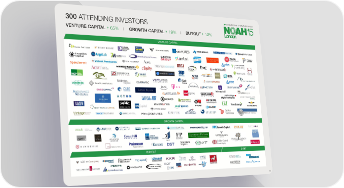 NOAH 2016 London Overview Page 18 Page 20300 ATTENDING INVESTORS VENTURE CAPITAL 65% GROWTH CAPITAL 19% BUYOUT 13% VENTURE CAPITAL eventures GROWTH CAPITAL BUYOUT DEBT 18