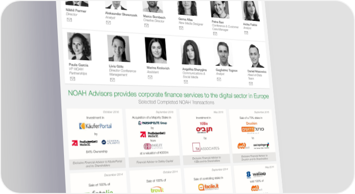 The NOAH Team ® Marco Rodzynek Jan Brandes Justus Lumpe Managing Director Managing Director Managing Director & Founder Nikhil Parmar Aleksander Skwarczek Marco Bombach Gema Alba Petra Ban Aicha Fakhir Director Analyst Creative Director New Media Designer Conference & Customer Analyst Care Manager Paula García Livia Götz Marina Krolovich Angelika Sharygina Guglielmo Tognon Daniel Wasowicz VP NOAH Director Conference Assistant Communications & Analyst Head of Data Partnerships Management Social Media Team NOAH Advisors provides corporate finance services to the digital sector in Europe Selected Completed NOAH Transactions October 2016 September 2016 May 2016 September 2015 Investment in Acquisition of a Majority Stake in Investment in Sale of a 70% stake in 10Bis Drushim by by from by to 84% Ownership at a valuation of €300m Exclusive Financial Advisor to KäuferPortal Financial Advisor to Oakley Capital Exclusive Financial Advisor to Exclusive Financial Advisor to and its Shareholders 10Bis and its Shareholders Drushim and its Shareholders December 2014 October 2014 September 2014 May 2014 Sale of 100% of Sale of 100% of Sale of controlling stake in sold 100% of for $800m to for €80m to to for $228m to a joint venture between Exclusive Financial Advisor to Exclusive Financial Advisor to Exclusive Financial Advisor to Exclusive Financial Advisor to Yad2 Fotolia and the Selling Shareholders Trovit and its Shareholders Facile.it and its Shareholders and its Shareholders SAVE THE DATE 22 - 23 June Tempodrom 2017 Berlin