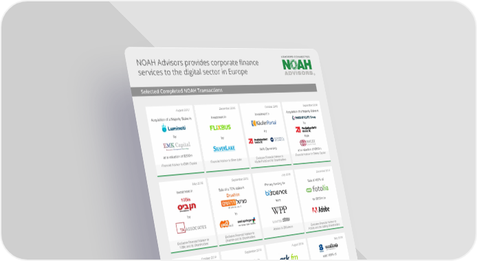 NOAH Advisors provides corporate finance services to the digital sector in Europe Selected Completed NOAH Transactions August 2017 December 2016 October 2016 September 2016 Acquisition of a Majority Stake in Investment in Investment in Acquisition of a Majority Stake in by by by by from at a valuation of $200m 84% Ownership at a valuation of €300m Financial Advisor to EMK Capital Financial Advisor to Silver Lake Exclusive Financial Advisor to Financial Advisor to Oakley Capital KäuferPortal and its Shareholders May 2016 September 2015 July 2015 December 2014 Investment in Sale of a 70% stake in Primary funding for Sale of 100% of 10Bis Drushim from for $800m to by to Exclusive Financial Advisor to Exclusive Financial Advisor to Advisor to BIScience Exclusive Financial Advisor to 10Bis and its Shareholders Drushim and its Shareholders Fotolia and the Selling Shareholders October 2014 September 2014 August 2014 May 2014 Sale of 100% of Sale of controlling stake in sold 100% of for €80m to to sale to for $228m to a joint venture between Exclusive Financial Advisor to Exclusive Financial Advisor to Advisor to the Selling Shareholders Exclusive Financial Advisor to Yad2 Trovit and its Shareholders Facile.it and its Shareholders and its Shareholders February 2013 May 2012 April 2012 December 2011 Sale of 100% in Fund raising for Growth equity investment from $150 million growth equity investment from to for a 30% stake for a 50% stake alongside Fotolia’s from various investors including alongside Softonic’s Founders Founders and TA Associates Angel Investors and Angel Investors at a Additional $150 million senior valuation of €275m debt financing Exclusive Financial Advisor to Financial Advisor to Fotolia and Financial Advisor to Toprural Advisor to Work4 Labs Softonic and its shareholders its Shareholders and its Shareholders 6