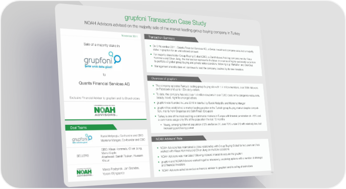 grupfoni Transaction Case Study NOAH Advisors advised on the majority sale of the market leading group buying company in Turkey Transaction Summary November 2011 Sale of a majority stake in On 9 November 2011, Quants Financial Services AG, a Swiss investment company acquired a majority stake in grupfoni for an undisclosed amount For majority shareholder Group Buying Global (GBG), a Zurich-based holding company run by Klaus Hommels and Oliver Jung, the transaction represents the latest in a series of highly successful exits from its portfolio of global group buying and private sales operators, following e.g. Markafoni and DeinDeal Management shareholders will continue to lead the company, backed by its new investors to Overview of grupfoni Quants Financial Services AG The company operates Turkey’s leading group buying site with 1.4 million members, over 300k followers on Facebook and up to 150k daily visitors To date, the company has sold over 1.4 million coupons in over 7,000 deals in the categories restaurants, Exclusive Financial Advisor to grupfoni and its Shareholders beauty, travel, nightlife amongst others grupfoni was founded in June 2010 in Istanbul by Burak Hatipolu and Münteha Mangan grupfoni has established a market leading position in the Turkish group buying market despite competi- tion, mainly from Grupanya and SehirFirsati (Groupon) ® Turkey is one of the most exciting e-commerce markets in Europe with Internet penetration of ~45% and e-commerce usage only 5% of the population the last 12 months Deal Teams Young, emerging Internet population (40% are below 24, over 70% under 34) with relatively low, but increasing purchasing power Burak Hatipoglu, Co-founder and CEO Münteha Mangan, Co-founder and CSO NOAH Advisors’ Role GBG: Klaus Hommels, Oliver Jung, NOAH Advisors has maintained a close relationship with Group Buying Global for two years and has SELLERS Manu Gupta worked with Klaus Hommels and Oliver Jung on multiple occasions AlterInvest: Samih Toukan, Hussam NOAH Advisors was mandated following inbound interest to acquire the grupfoni Khouri grupfoni and NOAH Advisors worked together intensively, exploring options with a number of strategic Marco Rodzynek, Jan Brandes, and financial investors ® Yoram Wijngaarde NOAH Advisors acted as exclusive financial advisor to grupfoni and its selling shareholders 40