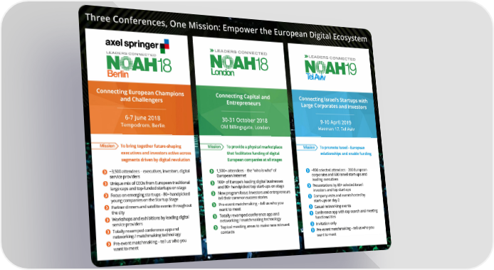 Three Conferences, One Mission: Empower the European Digital Ecosystem Connecting European Champions Connecting Capital and Connecting Israel’s Startups with and Challengers Entrepreneurs Large Corporates and Investors 6-7 June 2018 30-31 October 2018 9-10 April 2019 Tempodrom, Berlin Old Billingsgate, London Haoman 17, Tel Aviv Mission To bring together future-shaping Mission To provide a physical marketplace Mission To promote Israel - European executives and investors active across that facilitates funding of digital relationships and enable funding segments driven by digital revolution European companies at all stages ~3,500 attendees – executives, investors, digital 1,500+ attendees – the “who is who” of ~800 selected attendees – 200 European service providers European Internet corporates and 600 Israeli start-ups and Unique mix of CEOs from European traditional 100+ of Europe’s leading digital businesses leading executives large caps and top-funded startups on stage and 80+ handpicked top start-ups on stage Presentations by 60+ selected Israeli Focus on emerging start-ups - 80+ handpicked New program focus: Investors and entrepreneurs investors and top start-ups young companies on the Startup Stage tell their common success stories Company visits and events hosted by Partner dinners and satellite events throughout Pre-event matchmaking – tell us who you start-ups on day 2 the city want to meet Casual networking events Workshops and exhibitions by leading digital Totally revamped conference app and Conference app with top search and meeting service providers networking / matchmaking technology functionalities Totally revamped conference app and Topical meeting areas to make new relevant Invitation only networking / matchmaking technology contacts Pre-event matchmaking – tell us who you Pre-event matchmaking – tell us who you want to meet want to meet 15