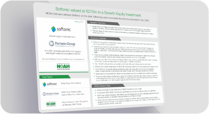Softonic valued at €275m in a Growth Equity Investment NOAH Advisors advised Softonic on the deal, following a prior successful transaction completed in Dec 2009 Transaction Summary February 2013 Tomás Diago and Partners Group make up the majority of the shareholders team and lead Softonic together. However, Partners Group acquired 30% of Softonic and is the biggest single shareholder Partners Group will help Softonic to expand internationally, accelerate business development, and fund future acquisitions Growth equity investment from Overview of Softonic Softonic is the globally leading online consumer guide for software and apps, that helps people discover and enjoy software on any platform Tomás Diago created the concept behind Softonic in July 1997 and has since built the Company into a top-40 website worldwide with well over 140M users across various types of devices and platforms. for a 30% stake alongside Softonic’s Founders Softonic is also the #1 worldwide technology website and leading European-based internet company by traffic and Angel Investors at a valuation of €275m Following a successful global expansion, Softonic has become the worldwide #1 platform for software authors to market, distribute and monetize their products in more than 10 languages Exclusive Financial Advisor to Softonic and its shareholders With well over 160 million monthly downloads, Softonic has unrivalled global distribution power, enabling it to provide a unique one-stop-shop for various types of software advertising Over 160,000 software titles are available on Softonic with expert reviews, articles and videos Softonic has a global organization of about 350 employees, half of which are engineers and expert editors ® The $150 billion consumer software market has seen a shift away from license fees and software in boxes, towards freemium online/SaaS distribution models, which has been favorable for Softonic Mass-adoption of smartphones, tablets and app stores have led to a proliferation of software and apps Deal Teams These favorable market developments, along with Softonic’s attractive high margin business model and consistent growth track-record, make Softonic a highly attractive investment opportunity that moreover has a healthy pipeline of further growth opportunities for Partners Group Tomás Diago, Emilio Moreno NOAH Advisors’ Role Walter Keller, Stephan Seissl, Softonic has been a close relationship of NOAH Advisors for over 3 years Eugenio Marschner, Carlos Sanz In December 2009, NOAH Advisors advised Softonic on its sale of a minority stake to Digital River NOAH had worked intensively with Softonic and its shareholders on various strategic opportunities and discussed a future collaboration between Softonic and Partners Group Marco Rodzynek, Yoram Wijngaarde, NOAH Advisors acted as exclusive financial advisor to Softonic and its shareholders, and facilitated a Jan Brandes, Nikhil Parmar steadfast execution based on in-depth knowledge of the company, the industry, and intelligence around ® the best potential investor candidates 37