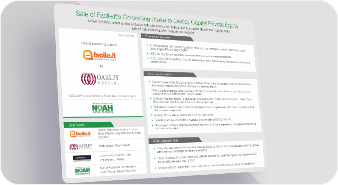 Sale of Facile.it’s Controlling Stake to Oakley Capital Private Equity NOAH Advisors acted as the exclusive sell-side advisor to Facile.it and its shareholders in the majority stake sale of Italy’s leading price comparison website Transaction Summary September 2014 Sale of controlling stake in On 19 September 2014, controlling stake in Italy’s top price comparison website Facile.it was sold to Oakley Capital Private Equity (“OCPE”) OCPE will help Facile.it expand its operations and accelerate business development Facile.it joins Oakley’s portfolio of leading online brands which already includes German price comparison website Verivox to Overview of Facile.it Founded in April 2008, Facile.it is Italy’s #1 destination for consumers to make informed decisions about their motor insurance, household expenses and personal finance With a portfolio of gross written premia of €260m and over 580k clients Facile.it is by far the country’s largest (online and offline) motor insurance broker Exclusive Financial Advisor to Facile.it and its Shareholders Its strong insurance position is increasingly leveraged in other related verticals like ADSL, Gas & Power, Bank Accounts and, from mid-2014, also Cellular contracts Well-known household brand with 80% (prompted) brand recognition and 20% “top of mind” (twice that of the nearest competitor) ® Average of 1.4m unique visitors and 2.1m visits per month Expects to achieve over €35m of revenues and over €8m of EBITDA in 2014E Deal Teams Milan-based company employs 126 people and is run by a highly experienced management team led by Alberto Genovese, Andrea Piccioni, CEO Mauro Giacobbe Silvio Pagliani, Luigi Berlusconi, Angel Investors NOAH Advisors’ Role Mark Joseph, David Keech NOAH Advisors acted as the exclusive financial advisor to Facile.it and its shareholders, exploring options Luca Fossati, Patrizia Liguti, with a number of strategic and financial investors Christopher J. Mullen Facile.it has been in a close relationship of NOAH Advisors for a number of years and has presented at the NOAH Conference 2012 & 2013 Marco Rodzynek, Jan Brandes, Nikhil Parmar, Marija Sevcenko Chiomenti Studio Legale (Milan and London offices) acted as legal advisor to Facile.it’s shareholders ® 35