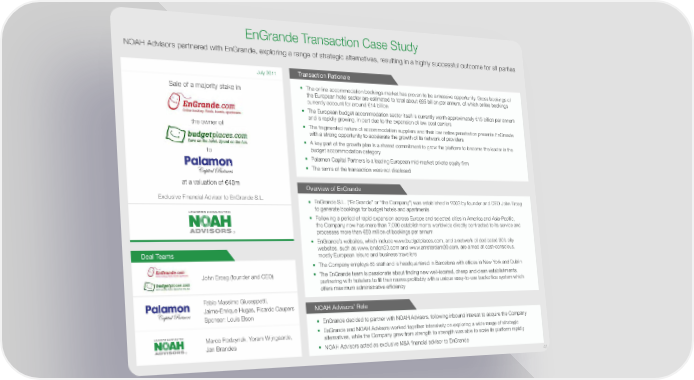 EnGrande Transaction Case Study NOAH Advisors partnered with EnGrande, exploring a range of strategic alternatives, resulting in a highly successful outcome for all parties Transaction Rationale July 2011 Sale of a majority stake in The online accommodation bookings market has proven to be a massive opportunity. Gross bookings of the European hotel sector are estimated to total about €85 billion per annum, of which online bookings currently account for around €14 billion The European budget accommodation sector itself is currently worth approximately €15 billion per annum and is rapidly growing, in part due to the expansion of low cost carriers the owner of The fragmented nature of accommodation suppliers and their low online penetration presents EnGrande with a strong opportunity to accelerate the growth of its network of providers A key part of the growth plan is a shared commitment to grow the platform to become the leader in the to budget accommodation category Palamon Capital Partners is a leading European mid-market private equity firm The terms of the transaction were not disclosed at a valuation of €40m Overview of EnGrande Exclusive Financial Advisor to EnGrande S.L. EnGrande S.L. (“EnGrande” or “the Company”) was established in 2003 by founder and CEO John Erceg to generate bookings for budget hotels and apartments Following a period of rapid expansion across Europe and selected cities in America and Asia-Pacific, the Company now has more than 7,000 establishments worldwide directly contracted to its service and ® processes more than €80 million of bookings per annum EnGrande’s websites, which include www.budgetplaces.com, and a network of dedicated 30’s city websites, such as www.london30.com and www.amsterdam30.com, are aimed at cost-conscious, Deal Teams mostly European leisure and business travellers The Company employs 85 staff and is headquartered in Barcelona with offices in New York and Dublin John Erceg (founder and CEO) The EnGrande team is passionate about finding new well-located, cheap and clean establishments, partnering with hoteliers to fill their rooms profitably with a unique easy-to-use backoffice system which offers maximum administrative efficiency Fabio Massimo Giuseppetti, Jaime-Enrique Hugas, Ricardo Caupers NOAH Advisors’ Role Sponsor: Louis Elson EnGrande decided to partner with NOAH Advisors, following inbound interest to acquire the Company Marco Rodzynek, Yoram Wijngaarde, EnGrande and NOAH Advisors worked together intensively on exploring a wide range of strategic alternatives, while the Company grew from strength to strength was able to scale its platform rapidly ® Jan Brandes NOAH Advisors acted as exclusive M&A financial advisor to EnGrande 41