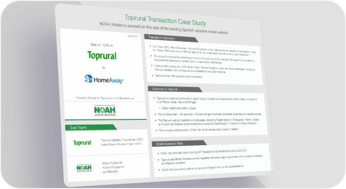 Toprural Transaction Case Study NOAH Advisors advised on the sale of the leading Spanish vacation rental website Transaction Summary April 2012 Sale of 100% in On 2 April 2012, HomeAway Inc., the world’s largest online marketplace for vacation rentals based in Aus- tin, Texas, USA, acquired a 100% of Toprural for an undisclosed amount in an all-cash transaction The acquisition broadens HomeAway’s reach in Europe and adds inventory that appeals to a seekers of long weekend getaways to small towns or countryside destinations Following the acquisition, COO Rafael Pérez-Olivares Hoepfl will serve as General Manager and replace to François Derbaix, who will stay on as a consultant during the transition. Toprural is the 18th acquisition for HomeAway Overview of Toprural Financial Advisor to Toprural and its Shareholders Toprural is a rural accommodation search engine focused on independently owned rental properties in rural France, Spain, Italy and Portugal Clear market leadership in Spain ® The company has ~12k paid and ~30k free listings for bed-and-breakfast properties and vacation rentals The Toprural website operates in 8 languages, including English Spanish, Portuguese, French, Catalan Deal Teams and Dutch and features accommodations varying from farmhouses in Tuscany to fincas in Mallorca The company was founded in 2000, has 46 employees and is based in Madrid Francois Derbaix, Founder and CEO Rafael Pérez-Olivares Hoepfl, COO NOAH Advisors’ Role NOAH Advisors has been working with Toprural and its shareholders since early 2010 Marco Rodzynek Toprural and NOAH Advisors worked together intensively, exploring options with a number of strategic Yoram Wijngaarde and financial investors ® Jan Brandes NOAH Advisors acted as financial advisor to Toprural and its selling shareholders 39