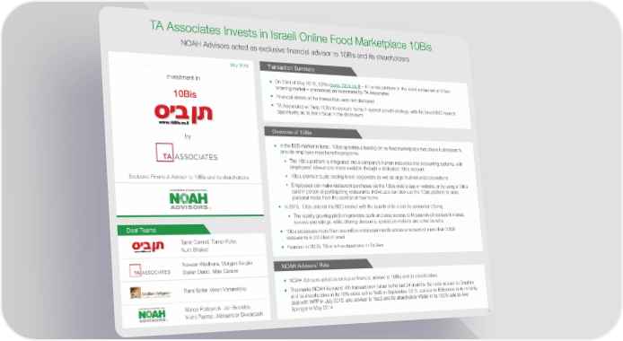 TA Associates Invests in Israeli Online Food Marketplace 10Bis NOAH Advisors acted as exclusive financial advisor to 10Bis and its shareholders Transaction Summary May 2016 Investment in On 23rd of May 2016, 10Bis (www.10bis.co.il) – #1 online platform in the Israeli restaurant and food ordering market – announced an investment by TA Associates 10Bis Financial details of the transaction were not disclosed TA Associates will help 10Bis to execute its multi-layered growth strategy, with the Israeli B2C market opportunity as its main focus in the short-term Overview of 10Bis by In the B2B market in Israel, 10bis operates a leading online food marketplace that allows businesses to provide employee meal benefits programs The 10bis platform is integrated into a company’s human resources and accounting systems, with employees’ allowances made available through a dedicated 10bis account Exclusive Financial Advisor to 10Bis and its shareholders 10bis clients include leading Israeli corporates as well as large multinational corporations Employees can make restaurant purchases via the 10bis mobile app or website, or by using a 10bis card in person at participating restaurants. Individuals can also use the 10bis platform to order personal meals from the comfort of their home ® In 2015, 10bis entered the B2C market with the launch of its direct-to-consumer offering The rapidly growing platform provides quick and easy access to thousands of restaurant menus, reviews and ratings, while offering discounts, special promotions and other benefits Deal Teams 10bis processes more than one million orders per month across a network of more than 3,500 Tamir Carmel, Tomer Fefer, restaurants in 20 cities in Israel Nurit Shaked Founded in 2000, 10bis is headquartered in Tel Aviv Naveen Wadhera, Morgan Seigler, NOAH Advisors’ Role Stefan Dandl, Max Cancre NOAH Advisors acted as exclusive financial advisor to 10Bis and its shareholders Rami Sofer, Veran Vistanetzky This marks NOAH Advisors’ 4th transaction in Israel in the last 24 months: Sell-side advisor to Drushim and its shareholders in its 70% stake sell to Yad2 in September 2015, advisor to BiScience in its minority Marco Rodzynek, Jan Brandes, deal with WPP in July 2015, and advisor to Yad2 and its shareholder Walla! in its 100% sale to Axel Nikhil Parmar, Aleksander Skwarczek Springer in May 2014 ® 31