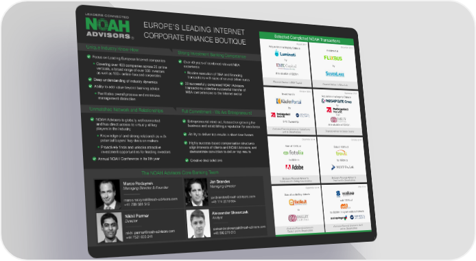 EUROPE’S LEADING INTERNET Selected Completed NOAH Transactions CORPORATE FINANCE BOUTIQUE August 2017 December 2016 ® Acquisition of a Majority Stake in Investment in Unique Industry Know-How Strong Investment Banking Competence by by Focus on Leading European Internet companies Over 40 years of combined relevant M&A Covering over 400 companies across 25 online experience at a valuation of $200m verticals, a broad range of over 500 investors Routine execution of M&A and financing as well as 100+ online-focused corporates transactions with sizes of several billion euros Financial Advisor to EMK Capital Financial Advisor to Silver Lake Deep understanding of industry dynamics 30 successfully completed NOAH Advisors transactions underline successful transfer of October 2016 September 2016 Ability to add value beyond banking advice M&A competencies to the Internet sector Investment in Acquisition of a Majority Stake in Facilitates overall process and minimizes management distraction by by Unmatched Network and Relationships Full Commitment - We Are Entrepreneurs! from NOAH Advisors is globally well connected Entrepreneurial mind-set, focused on growing the 84% Ownership at a valuation of €300m and has direct access to virtually all key business and establishing a reputation for excellence Exclusive Financial Advisor to KäuferPortal players in the industry and its Shareholders Financial Advisor to Oakley Capital Knowledge of and strong relationships with Ability to deliver top results in short time frames potential buyers’ key decision makers December 2014 October 2014 Highly success-based compensation structures Sale of 100% of Proactively finds and unlocks attractive align interests of clients and NOAH Advisors, and Sale of 100% of investment opportunities for leading investors demonstrate conviction to deliver top results Annual NOAH Conference in its 8th year Creative deal solutions for $800m to for €80m to The NOAH Advisors Core Banking Team Marco Rodzynek Jan Brandes Exclusive Financial Advisor to Exclusive Financial Advisor to Fotolia and the Selling Shareholders Trovit and its Shareholders Managing Director & Founder Managing Director September 2014 May 2014 [email protected] [email protected] Sale of controlling stake in +41 799 581 512 +49 174 2010 984 sold 100% of Nikhil Parmar Aleksander Skwarczek to Director Analyst for $228m to a joint venture between [email protected] [email protected] +44 7521 835 241 +48 692 270 613 Exclusive Financial Advisor to Exclusive Financial Advisor to Yad2 Facile.it and its Shareholders and its Shareholders 4
