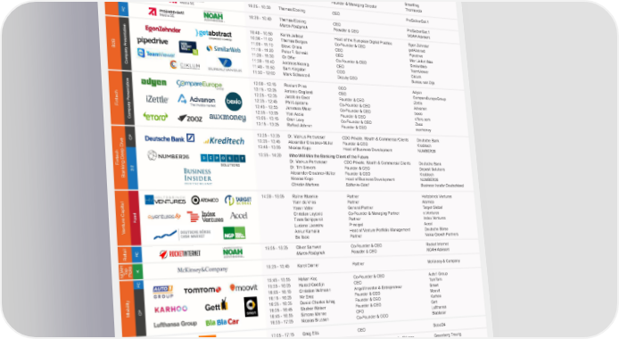 COLOSSEUM - Day 1 8 June 2016 SESSION TITLE COMPANY TIME SPEAKER POSITION COMPANY Breakfast 8:00 - 9:00 9:00 - 9:10 Marco Rodzynek Founder & CEO NOAH Advisors elcomeNote Keynote ® Dr. Jens Müffelmann CEO Axel Springer Digital Ventures W K 9:10 - 9:25 Dr. Klaus Hommels Founder & CEO Lakestar K 9:25 - 9:35 Carlos Watson Founder & CEO OZY Media IoT 9:35 - 9:45 Niall Murphy Founder & CEO EVRYTHNG & 9:45 - 9:55 Ludovic Le Moan CEO Sigfox CP 9:55 - 10:05 Christian Deilmann Co-Founder & Managing Director tado° Home 10:05 - 10:15 Andreas Rudyk Co-Founder Smartfrog Automation 10:15 - 10:25 Philipp A. Pausder Founder & Managing Director Thermondo K 10:25 - 10:30 Thomas Ebeling CEO ProSiebenSat.1 10:30 - 10:40 Thomas Ebeling CEO ProSiebenSat.1 FC Marco Rodzynek Founder & CEO NOAH Advisors ® 10:40 - 10:50 Karim Jalbout Head of the European Digital Practice Egon Zehnder 10:50 - 11:00 Thomas Bergen Co-Founder & CEO getAbstract 11:00 - 11:10 Steve Oriola CEO Pipedrive esentation 11:10 - 11:20 Peter F. Schmid CEO Wer Liefert Was Pr B2B 11:20 - 11:30 Or Offer Co-Founder & CEO SimilarWeb 11:30 - 11:40 Andreas Koenig CEO TeamViewer Company 11:40 - 11:50 Sam Kingston COO Ciklum 11:50 - 12:00 Mark Schwerzel Deputy CEO Bureau van Dijk 12:00 - 12:15 Roelant Prins CCO Adyen 12:15 - 12:25 Antonio Gagliardi CEO CompareEuropeGroup 12:25 - 12:35 Jacob de Geer Founder & CEO iZettle esentation 12:35 - 12:45 Phil Lojacono Co-Founder & CEO Advanon Pr Fintech 12:45 - 12:55 Jeremias Meier Co-Founder & CEO bexio 12:55 - 13:05 Yoni Assia Founder & CEO eToro.com Company 13:05 - 13:15 Oren Levy Co-Founder & CEO Zooz 13:15 - 13:25 Raffael Johnen Founder & CEO auxmoney 13:25 - 13:35 Dr. Markus Pertlwieser CDO Private, Wealth & Commercial Clients Deutsche Bank CP 13:35 - 13:45 Alexander Graubner-Müller Founder & CEO Kreditech Dive 13:45 - 13:55 Nicolas Kopp Head of Business Development NUMBER26 13:55 - 14:20 Who Will Win the Banking Client of the Future Deep Dr. Markus Pertlwieser CDO Private, Wealth & Commercial Clients Deutsche Bank Fintech Dr. Tim Sievers Founder & CEO Deposit Solutions 2:2 Alexander Graubner-Müller Founder & CEO Kreditech Banking Nicolas Kopp Head of Business Development NUMBER26 Christin Martens Editor-in-Chief Business Insider Deutschland 14:20 - 15:05 Rainer Maerkle Partner Holtzbrinck Ventures Yann de Vries Partner Atomico Yaron Valler General Partner Target Global Capital Christian Leybold Co-Founder & Managing Partner e.Ventures eventures e Panel Timm Schipporeit Partner Index Ventures entur Luciana Lixandru Principal Accel V Ankur Kamalia Head of Venture Portfolio Management Deutsche Börse Bo Ilsoe Partner Nokia Growth Partners 15:05 - 15:25 Oliver Samwer Co-Founder & CEO Rocket Internet FC Marco Rodzynek Founder & CEO NOAH Advisors Retail ® p K 15:25 - 15:45 Karel Dörner Partner McKinsey & Company NOAHToPicks FC 15:45 - 15:55 Hakan Koç Co-Founder & CEO Auto1 Group 15:55 - 16:05 Harold Goddijn CEO TomTom 16:05 - 16:15 Christian Vollmann Angel Investor & Entrepreneur Smart 16:15 - 16:25 Nir Erez Founder & CEO Moovit Mobility CP 16:25 - 16:35 Daniel Charles Ishag Founder & CEO Karhoo 16:35 - 16:45 Shahar Waiser Founder & CEO Gett 16:45 - 16:55 Simone Menne CFO Lufthansa 16:55 - 17:05 Nicolas Brusson Co-Founder & COO Blablacar K 17:05 - 17:15 Greg Ellis CEO Scout24 17:15 - 17:35 Rudolph W. Giuliani Global Chair Cybersecurity, Privacy Greenberg Traurig p and Crisis Management Practice NOAHToPicks CP Bill Morrow CEO and Executive Chairman Quarri Technologies 17:35 - 17:50 Peter Terium CEO RWE 1:1 Rainer Sternfeld Founder & CEO Planet OS ® Marco Rodzynek Founder & CEO NOAH Advisors 17:50 - 18:10 Dr. Mathias Döpfner CEO Axel Springer 1:1 Henry Blodget CEO Business Insider 18:10 - 18:20 Dr. Dieter Zetsche Chairman of the Board of Management Daimler CP 18:20 - 18:30 Travis Kalanick Founder & CEO UBER Mobility 18:30 - 19:00 Dr. Dieter Zetsche Chairman of the Board of Management Daimler FC Travis Kalanick Founder & CEO UBER Kai Diekmann Editor-in-Chief Bild 19:00 - 19:10 Thomas Hampson, Baritone Ambassador IDAGIO Music CP Wolfram Rieger, Piano Party 22:00 - 2:00 Party @ Tempodrom with DJ Guy Gerber Lunch served between 11:30 - 15:00 K Keynote CP Company Presentation FC Fireside Chat P Panel