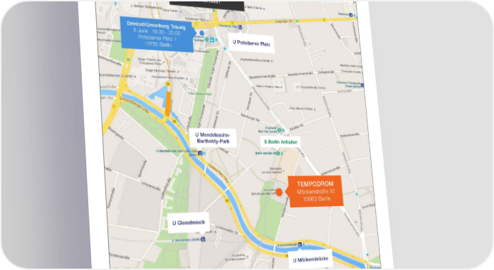 Finding Tempodrom WeWork Pre-Party Cocktails 8 June 19:30 - 22:00 WeWork Sony Center Kemperplatz 1, Building A 10785 Berlin Drinks@Greenberg Traurig 8 June 19:30 - 22:00 Potsdamer Platz 1 U Potsdamer Platz 10785 Berlin U Mendelssohn- Bartholdy-Park S Berlin Anhalter TEMPODROM Möckenstraße 10 10963 Berlin U Gleisdreieck U Möckernbrücke 6
