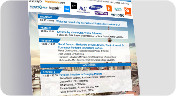 CEO Summit: E-Commerce in EmergingMarkets Thursday 9 June2016 Tempodrom, Berlin Attended by C-Level Executives of Global Brands, Ecommerce and Payment Companies, including: WELCOME 09:50 - 10:00 Welcome remarks by International Finance Corporation (IFC) KEYNOTE 10:00 - 10:30 Keynote by Nicole Otto, VP/GM Nike.com Followed by Q&A fireside chat moderated by Maria Thomas, former CEO Etsy SESSION 1 10:30 - 11:15 Global Brands > Navigating between Brands, Distributors and E- CommercePlatforms in Emerging Markets Merve Diken Durmus, Associate Director Procter & Gamble Abdo Chalala, VP Samsung Domenico Guttadauro Mancinell, Chief Commercial Officer Al Hokair Moderated by Mary Ghobrial, Chief Commercial Officer Souq.com Coffee Break SESSION 2 11:45 – 12:30 Payment Providers in Emerging Markets Stefan Klestil, Wirecard Board member and Partner Speedinvest Gustavo Ruiz, CEO SafetyPay OrkunSaitoglu, COO Iyzico Ricardo Siqueira, Founder and CEO Koin Mario Shiliashki, CEO PayU EMEA SESSION 3 12:30 - 13:00 Leading Innovation in Emerging Markets Companypresentations Hosted by: Register for NOAH16 on:register.noah-conference.com More information about the event and/or speaking opportunities: contact idegraaf@ifc.org