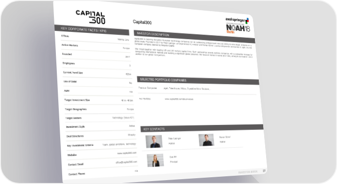 Capital300 KEY CORPORATE FACTS / KPIS INVESTOR DESCRIPTION Offices Vienna, Linz capital300 is backing disruptive European technology companies run by outstanding entrepreneurs who are willing to solve tough problems on a global scale. Founded in 2017 by Peter Lasinger, an experienced VC investor and Roman Scharf, a serial entrepreneur and founder of Jajah, the first European company backed by Sequoia Capital. Active Markets Europe Weinvest together with leading US and UK venture capital firms. Such partnerships provide portfolio companies with a substantial leverage for conquering international markets and building a significant global presence. We focus on Series A rounds (€ 2-10M), aiming to co-invest € 1+M in addition to our global fund partners. Founded 2017 Employees 3 Current Fund Size €25m SELECTED PORTFOLIO COMPANIES Use of Debt No Previous Companies Jajah, Talenthouse, Hitbox, Crystalline Mirror Solutions,… AUM n/a Target Investment Size €1m - €10m Full Portfolio www.capital300.com/#businesses Target Geographies Europe Target Sectors Technology (focus ICT) Investment Style Active KEY CONTACTS Deal Structures Minority [Photo] Peter Lasinger Roman Scharf Key Investment Criteria Team, global ambitions, technology Partner [Photo] Partner Website www.capital300.com [Photo] Eva Arh Contact Email office@capital300.com Principal Contact Phone n/a INVESTOR BOOK 27