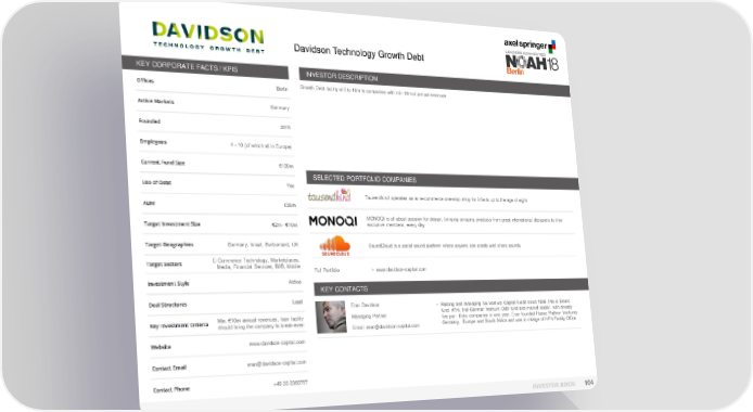 Davidson Technology Growth Debt KEY CORPORATE FACTS / KPIS INVESTOR DESCRIPTION Offices Berlin Growth Debt facility of 2 to 10m to companies with min 10m of annual revenues Active Markets Germany Founded 2015 Employees 4 - 10 (of which all in Europe) Current Fund Size €100m SELECTED PORTFOLIO COMPANIES Use of Debt Yes Tausendkind operates as an e-commerce one-stop shop for infants up to the age of eight AUM €25m MONOQI is all about passion for design, bringing amazing products from great international designers to their Target Investment Size €2m - €10m exclusive members, every day Target Geographies Germany, Israel, Switzerland, UK SoundCloud is a social sound platform where anyone can create and share sounds Target Sectors E-Commerce Technology, Marketplaces, Media, Financial Services, B2B, Mobile Full Portfolio • www.davidson-capital.com Investment Style Active KEY CONTACTS Deal Structures Lead Eran Davidson • Raising and managing six Venture Capital funds since 1996, this is Eran’s Min. €10m annual revenues, loan facility Managing Partner fund #7m, first German Venture Debt fund and market leader, with already Key Investment Criteria should bring the company to break-even five por- tfolio companies in one year. Eran founded Hasso Plattner Ventures Email: eran@davidson-capital.com Germany, Europe and South Africa and was in charge of HP’s Family Office Website www.davidson-capital.com Contact Email eran@davidson-capital.com Contact Phone +49 30 2360767 INVESTOR BOOK 104