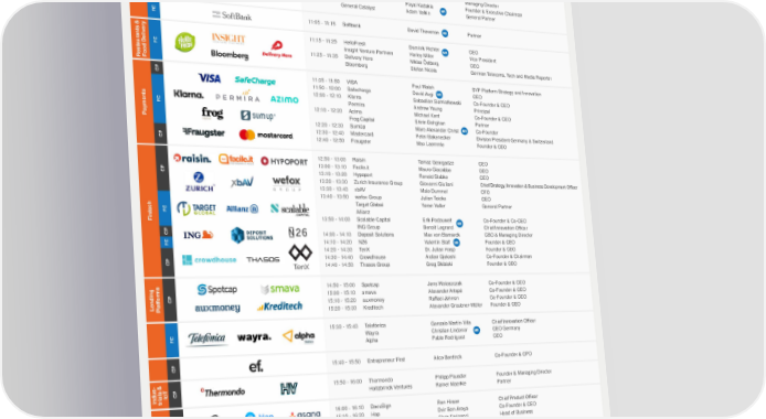 COLOSSEUM - Day 2 7 June 2018 SESSION TITLE COMPANY TIME COMPANY SPEAKER POSITION Breakfast 8:00 - 10:00 K 9:30 - 9:35 Day 1 Summary ® NOAH Advisors Marco Rodzynek Founder & CEO 9:35 - 9:45 Tamedia Christoph Brand Head of Classifieds & Marketplaces 9:45 - 9:55 HuffPost Jared Grusd CEO CP 9:55 - 10:05 Minute Media Asaf Peled Founder & CEO 10:05 - 10:15 Epidemic Sound Oscar Höglund Co-Founder & CEO 10:15 - 10:25 MUBI Efe Cakarel Founder & CEO 10:25 - 10:35 Unikrn Rahul Sood Co-Founder & CEO 10:35 - 10:45 LegalZoom John Suh CEO FC Digital & TMT Permira Dipan Patel Partner CP 10:45 - 10:55 App Annie Nicolas Beraudo Managing Director 10:55 - 11:05 ClassPass Payal Kadakia Founder & Executive Chairman General Catalyst Adam Valkin MR General Partner FC FC 11:05 - 11:15 Softbank David Thevenon MR Partner 11:15 - 11:25 HelloFresh Dominik Richter MR CEO Insight Venture Partners Harley Miller Vice President FC 11:25 - 11:35 Delivery Hero Niklas Östberg CEO Restaurants &Food Delivery Bloomberg Stefan Nicola German Telecoms, Tech and Media Reporter CP 11:35 - 11:50 VISA Paul Walsh SVP Platform Strategy and Innovation 11:50 - 12:00 Safecharge David Avgi MR CEO 12:00 - 12:10 Klarna Sebastian Siemiatkowski Co-Founder & CEO Permira Andrew Young Principal FC 12:10 - 12:20 Azimo Michael Kent Co-Founder & CEO Payments Frog Capital Shirin Dehghan Partner 12:20 - 12:30 SumUp Marc-Alexander Christ MR Co-Founder 12:30 - 12:40 Mastercard Peter Bakenecker Division President Germany & Switzerland CP 12:40 - 12:50 Fraugster Max Laemmle Founder & CEO 12:50 - 13:00 Raisin Tamaz Georgadze CEO 13:00 - 13:10 Facile.it Mauro Giacobbe CEO CP 13:10 - 13:20 Hypoport Ronald Slabke CEO 13:20 - 13:30 Zurich Insurance Group Giovanni Giuliani Chief Strategy, Innovation & Business Development Officer 13:30 - 13:40 xbAV Male Dummel CFO 13:40 - 13:50 wefox Group Julian Teicke CEO Target Global Yaron Valler General Partner FC Allianz Fintech 13:50 - 14:00 Scalable Capital Erik Podzuweit MR Co-Founder & Co-CEO ING Group Benoît Legrand Chief Innovation Officer CP 14:00 - 14:10 Deposit Solutions Max von Bismarck CBO & Managing Director FC 14:10 - 14:20 N26 Valentin Stalf MR Founder & CEO 14:20 - 14:30 TenX Dr. Julian Hosp Founder & CEO 14:30 - 14:40 Crowdhouse Ardian Gjeloshi Co-Founder & Chairman CP 14:40 - 14:50 Thasos Group Greg Skibiski Founder & CEO 14:50 - 15:00 Spotcap Jens Woloszczak Co-Founder & CEO 15:00 - 15:10 smava Alexander Artopé Co-Founder & CEO CP 15:10 - 15:20 auxmoney Raffael Johnen Co-Founder & CEO LendingPlatforms 15:20 - 15:30 Kreditech Alexander Graubner-Müller Founder & CEO 15:30 - 15:40 Telefónica Gonzalo Martín-Villa Chief Innovation Officer FC Wayra Christian Lindener MR CEO Germany Alpha Pablo Rodriguez CEO CP 15:40 - 15:50 Entrepreneur First Alice Bentinck Co-Founder & CPO - 15:50 - 16:00 Thermondo Philipp Pausder Founder & Managing Director Indus IoT CP Holtzbrinck Ventures Rainer Maerkle Partner trials & 16:00 - 16:10 DocuSign Ron Hirson Chief Product Officer CP 16:10 - 16:20 Hop Dvir Ben-Aroya Co-Founder & CEO 16:20 - 16:30 Asana Chris Farinacci Head of Business Generation Investment Management FC 16:30 - 16:40 Dealroom.co Yoram Wijngaarde MR Founder & CEO 16:40 - 16:50 TeamViewer Oliver Steil CEO Permira Stefan Dziarski Partner B2B & Software 16:50 - 17:00 Trustpilot Peter Mühlmann Founder & CEO 17:00 - 17:10 Kariyer.net Fatih Uysal CEO CP 17:10 - 17:20 Unmanned Life Kumardev Chatterjee Founder & CEO 17:20 - 17:30 Scytl Holger Taubmann CEO 17:30 - 17:40 Control€xpert Nicolas Witte CEO K 17:40 - 17:45 Closing Note ® NOAH Advisors Marco Rodzynek Founder & CEO 17:45 Networking Drinks Lunch served between 11:30 - 15:00 CP Company Presentation K Keynote P Panel FC Fireside Chat MR Interview / Panel with participation of Marco Rodzynek Founder & CEO, NOAH Advisors 8