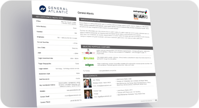 General Atlantic KEY CORPORATE FACTS / KPIS INVESTOR DESCRIPTION Offices New York, Munich, London General Atlantic is a leading global growth equity firm providing capital and strategic support for growth companies. Established in 1980, General (+10 other offices globally) Atlantic combines collaborative global approach, sector-specific expertise, long-term investment horizon, and deep understanding of growth drivers and partners with great management to build exceptional businesses worldwide. Active Markets Global The three main differentiators are (i) the exclusive focus on growth investing, (ii) a patient capital base and (iii) a global, collaborative team con- Founded 1980 sisting of investment professionals, our Resources Group and a Special Advisors network of current and former senior executives. While most of our investments are minorities, General Atlantic is an active investor that steadily adds value by leveraging our global resources, helping our companies with growth acceleration, performance improvement, global access, human capital and capital markets topics. Employees 100 – 1,000 (of which 30 in Europe) Current Fund Size > $13bn SELECTED PORTFOLIO COMPANIES Use of Debt Selectively Leading consumer internet portfolio in the segments of price comparison, experience gift vouchers, matchmaking, beauty and well-being in Germany that is a carve-out of ProSiebenSat.1, one of the largest European TV AUM > $24bn conglomerates … Tech-enabled mobility provider in Germany, offering travelers a comprehensive range of bus routes across the EU Target Investment Size $25m - $500m and the U.S. through its online platform Target Geographies Global Adyen is a technology company that provides businesses with a single solution to accept payments anywhere in the world and delivers frictionless payments across online, mobile, and in-store Target Sectors Technology, Technology-enabled services Full Portfolio • www.generalatlantic.com/portfolio Investment Style Active KEY CONTACTS Deal Structures Flexible Joern Nikolay • Joined General Atlantic in 2008 Market position, management, market Managing Director, Head of DACH • Previously at TA Associates, Bain & Company and Morgan Stanley Key Investment Criteria dynamics, competitive advantage with • Board Memberships: Axel Springer Digital Classifieds (previous), FlixBus, intellectual property, barriers to entry Email: jnikolay@generalatlantic.com KäuferPortal, Hemnet (previous), ControlExpert, NuCom Group Website www.generalatlantic.com Christian Figge • Joined General Atlantic in 2012 Contact Email munich@generalatlantic.com Principal • Previously at BC Partners and L.E.K. Consulting Email: cfigge@generalatlantic.com • Board Memberships: Käuferportal, Flixbus, NuCom Group Contact Phone +49 89 558 932 710 INVESTOR BOOK 88