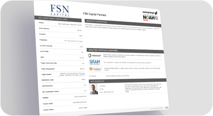 FSN Capital Partners KEY CORPORATE FACTS / KPIS INVESTOR DESCRIPTION Offices Oslo, Copenhagen, Stockholm, Munich FSN Capital is a leading Nordic private equity investment company focused on the middle-market segment. Originally established in 2000, FSN Capital seeks to make control investments in Nordic companies with significant potential to become international leaders. Active Markets Nordics Founded 2000 Employees 30 - 40 (of which all in Europe) Current Fund Size €1bn SELECTED PORTFOLIO COMPANIES Use of Debt Yes Mørenot Group consists of companies with leading positions in the international market as suppliers to customers in fisheries, aquaculture and marine seismic AUM €2.1bn Target Investment Size n/a Gram Equipment is a global market leader within advanced ice cream processing equipment Target Geographies Nordics Holmbergs Safety System is a leading global supplier of mission critical safety systems to the child safety seat industry Target Sectors Industrial, Business Services, Consumer & Retail, Healthcare & Education and TMT Full Portfolio • www.fsncapital.com/index.php/investments Investment Style Active KEY CONTACTS Deal Structures n/a Justin Kent • Justin joined FSN Capital in 2018. Prior to joining FSN, Justin spent nearly four years at Capvis Equity Partners, where he was responsible for Key Investment Criteria n/a Partner investments in the Consumer sector. Before that, Justin spent nearly eight years at The Riverside Company, focusing on investments throughout Email: [email protected] Europe. Website www.fsncapital.com Contact Email [email protected] Contact Phone +45 33134800 INVESTOR BOOK 100