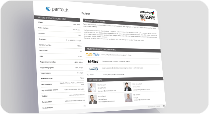 Partech KEY CORPORATE FACTS / KPIS INVESTOR DESCRIPTION Offices Paris, Berlin Partech is a transatlantic investment platform for tech and digital companies, dedicating capital and resources to support entrepreneurs from seed to growth on four continents. Active Markets USA, Europe The Partech Ventures team of 45 professionals / 12 partners in San Francisco, Paris and Berlin leads 50 to 70 investments per year across the whole tech spectrum, from digital services, software and security to hardware, electronics and advanced tech. Since 2012, Partech Ventures has Founded 1982 built a unique business development capacity to foster synergies and business relationships between entrepreneurs, strategic industry partners and a large network of angels and tech executives. Companies backed by Partech Ventures have completed 21initial public offerings and more than 50 exits above €100m. Employees 45 (of which 24 in Europe) Current Fund Size €950m SELECTED PORTFOLIO COMPANIES Use of Debt No Leading DIY products and services marketplace in Europe AUM €1.2bn Target Investment Size €200k - €40m Visionary entreprise information management software Target Geographies USA, Europe Leading cross-border direct business lending marketplace in continental Europe Target Sectors IT & Digital Full Portfolio • www.partechpartners.com/companies/ Investment Style Active KKEEYY COCONTNTAACTCTSS Deal Structures Majority, Minority, Flexible, Joint Control, Lead Omri Benayoun Olivier Schuepbach Key Investment Criteria Team, Market, Model, Momentum General Partner General Partner [email protected] [email protected] Website www.partechpartners.com BrunoCremel Otto Birnbaum Contact Email [email protected] General Partner Principal [email protected] [email protected] Contact Phone n/a INVESTOR BOOK 63
