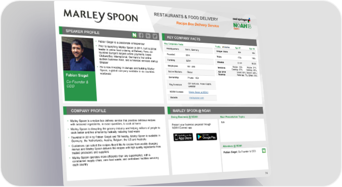RESTAURANTS & FOOD DELIVERY Recipe Box Delivery Service SPEAKER PROFILE KEY COMPANY FACTS • Fabian Siegel is a passionate entrepreneur Key Corporate Facts Traffic Apr-17 Apr-18 • Prior to launching Marley Spoon in 2014, built a global Headquarters Berlin, Germany Unique Users 80k 93k leader in online food ordering at Delivery Hero, co- Founded 2014 Visits 170k 193k founded Europe's largest online payments brand ClickandBuy International, Germany's first online Funding $27m Minutes 01:44 03:35 auction business Kikin, and a financial services startup Strateer Mobile: 43% Mobile: 54% Employees 100-1,000 Sessions Desktop: 57% Desktop: 46% • He is now investing in startups and building Marley Active Markets Global Apr 2018 Direct: 50%, Search: 25%, Spoon, a global company available in six countries Sources Referrals: 7%, Other: 18% worldwide Ownership Private - VCs Fabian Siegel Co-Founder & QD Ventures, Kreos Capital, Key Investors Lakestar CEO NOAH Content Marley Spoon at NOAH Website marleyspoon.com COMPANY PROFILE MARLEY SPOON @ NOAH Doing Business @ NOAH Main Presentation Topics • Marley Spoon is a recipe box delivery service that provides delicious recipes with seasonal ingredients, in exact quantities, to cook at home Present your business proposal through N/A • Marley Spoon is disrupting the grocery industry and helping millions of people to NOAH Connect app cook better and live smarter by radically reducing food waste • Founded in 2014 by Fabian Siegel and Till Neatby, Marley Spoon is available in Germany, the Netherlands, Austria, Belgium, the US and Australia • Customers can select the recipes they’d like to receive from weekly changing menus and Marley Spoon delivers the recipes with high quality ingredients from trusted producers and suppliers Attendees @ NOAH • Marley Spoon operates more efficiently than any supermarket, with a Fabian Siegel, Co-Founder & CEO constrained supply chain, zero food waste, and centralised facilities servicing each country 74