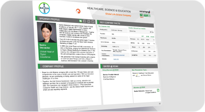 HEALTHCARE, SCIENCE & EDUCATION Global Life Sciene Company SPEAKER PROFILE KEY COMPANY FACTS • Saskia Steinacker was named Global Head of Digital Key Corporate Facts Valuation Data and Key Financials Excellence in February 2017. In this capacity, she Headquarters Leverkusen, Germany Market Cap €87.2bn leads Bayer’s digital transformation in close collaboration with the Board of Management. Together Founded 1863 with the divisions and functions she developed the 2017 2018E Growth company’s Digital Agenda with a focus on new Revenues €m 35,015 35,341 1% business models to accelerate new growth Employees 99,820+ • From 2013-2016 she lead the global digital IT function Active Markets Global EBITDA €m 8,801 9,443 7% for Bayer and prior to this the Bayer North America Marketing & Sales IT unit Ownership Public (ETR) Margin % 25% 27% - Saskia • In 2004 she joined Bayer and held a succession of roles in Marketing, ranging from Multichannel Marketer Steinacker Temasek, Vanguard Group, EV/Revenue 2.5x 2.5x (0%) to Head of Dialog Marketing for Diabetes Care. In this Key Shareholders NBIM, BlackRock Global Head of capacity she redesigned the customer interaction of Digital the unit and launched a state-of the art CRM program. Investor Click here to download EV/EBITDA 9.5x 9.4x (1%) Presentations Excellence • She graduated from Ecosign Academy with a degree in Communication Design and holds a Master in Website bayer.com Business Administration from Liverpool University COMPANY PROFILE BAYER @ NOAH Doing Business @ NOAH Main Presentation Topics • Bayer is a Life Science company with a more than 150-year history and core competencies in the areas of health care and agriculture. With our innovative Women in Healthcare Panel Discussion products, we are contributing to finding solutions to some of the major Service Provider Interest with and Simone Menne challenges of our time Business Intelligence • Together, the Life Science businesses make up a strong, attractive and CI & Data Science balanced portfolio that is resistant to fluctuations in demand and to potential risks. Our operations are managed in three divisions – Pharmaceuticals, Consumer Health and Crop Science – and the Animal Health business unit, which are also reporting segments Attendees @ NOAH Saskia Steinacker, Global Head of Digital Excellence All financial actual data and estimates provided by CapitaIQ, as of 06/05/2018. 20