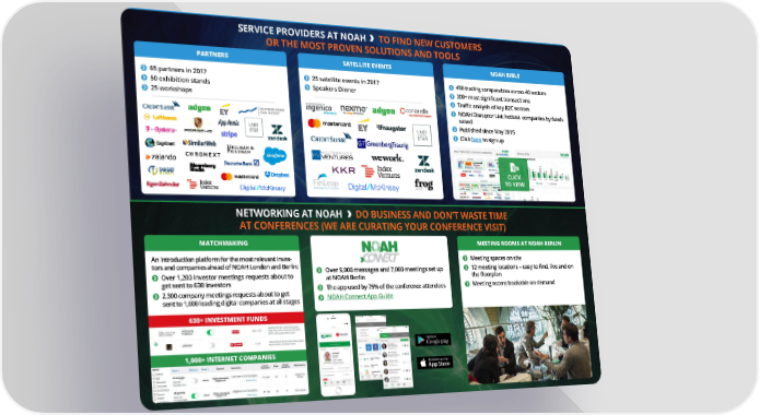SERVICE PROVIDERS AT NOAH TO FIND NEW CUSTOMERS OR THE MOST PROVEN SOLUTIONS AND TOOLS PARTNERS SATELLITE EVENTS NOAH BIBLE 65 partners in 2017 25 satellite events in 2017 450 trading comparables across 40 sectors 50 exhibition stands Speakers Dinner 300+ most significant transactions 25 workshops Traffic analysis of key B2C sectors NOAH Disruptor List: hottest companies by funds raised Published since May 2015 Click here to sign up CLICK TO VIEW NETWORKING AT NOAH DO BUSINESS AND DON’T WASTE TIME AT CONFERENCES (WE ARE CURATING YOUR CONFERENCE VISIT) MATCHMAKING MEETING ROOMS AT NOAH BERLIN An introduction platform for the most relevant inves- Meeting spaces on site tors and companies ahead of NOAH London and Berlin: Over 9,000 messages and 7,000 meetings set up 12 meeting locations – easy to find, live and on Over 1,200 investor meetings requests about to at NOAH Berlin the floorplan get sent to 630 investors The app used by 75% of the conference attendees Meeting rooms bookable on demand 2,300 company meetings requests about to get NOAH Connect App Guide sent to 1,000 leading digital companies at all stages 630+ INVESTMENT FUNDS 1,000+ INTERNET COMPANIES