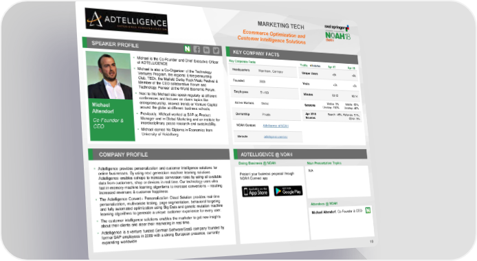 MARKETING TECH Ecommerce Optimization and CustomerIntelligence Solutions SPEAKER PROFILE KEY COMPANY FACTS • Michael is the Co-Founder and Chief Executive Officer Key Corporate Facts Traffic Apr-17 Apr-18 of ADTELLIGENCE Headquarters Mannheim, Germany Unique Users <5k <5k • Michael is also a Co-Organizer of the Technology Ventures Program, the regional Entrepreneurship Founded 2009 Visits <5k <5k Club, TEDx, the Maifeld Derby Rock Music Festival & Member of the CEO collaborative Forum and Technology Pioneer at the World Economic Forum. Employees 51-100 Minutes 03:12 03:14 • Next to this Michael also speak regularly at different conferences and lectures on divers topics like Active Markets Global Mobile: 0% Mobile: 62% entrepreneurship, internet trends or Venture Capital Sessions Desktop: 100% Desktop: 48% Michael around the globe at different business schools. Apr 2018 Search: 46%, Referrals: 51%, Ownership Private Altendorf • Previously, Michael worked at SAP as Product Sources Other: 3% Co-Founder & Manager and in Global Marketing and an institute for interdisciplinary peace research and sustainability. CEO NOAH Content Adtelligence at NOAH • Michael earned his Diploma in Economics from University of Heidelberg Website adtelligence.com/en/ COMPANY PROFILE ADTELLIGENCE @ NOAH Doing Business @ NOAH Main Presentation Topics • Adtelligence provides personalization and customer intelligence solutions for online businesses. By using next generation machine learning solutions Present your business proposal through N/A Adtelligence enables eshops to increase conversion rates by using all available NOAH Connect app data from customers, shop or devices in real time. Our technology uses ultra fast in-memory machine learning algorithms to increase conversions – resulting increased revenues & customer happiness • The Adtelligence Convert+ Personalization Cloud Solution provides real-time personalization, multivariate testing, page segmentation, behavioral targeting and fully automated optimization using Big Data and genetic mutation machine learning algorithms to generate a unique customer experience for every user. Attendees @ NOAH • The customer intelligence solutions enables the marketer to get new insights Michael Altendorf, Co-Founder & CEO about their clients and steer their marketing in real time. • Adtelligence is a venture funded German Software/SaaS company founded by former SAP employees in 2009 with a strong European presence, currently expanding worldwide 10