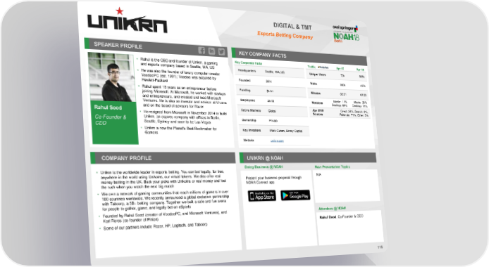 DIGITAL & TMT Esports Betting Company SPEAKER PROFILE KEY COMPANY FACTS • Rahul is the CEO and founder of Unikrn, a gaming Key Corporate Facts Traffic Apr-17 Apr-18 and esports company based in Seattle, WA, US Headquarters Seattle, WA, US Unique Users 70k 935k • Hewas also the founder of luxury computer creator VoodooPC (est. 1991); Voodoo was acquired by Founded 2014 Visits 300k 457k Hewlett-Packard • Rahul spent 18 years as an entrepreneur before Funding $41m Minutes 02:21 01:03 joining Microsoft. At Microsoft, he worked with startups and entrepreneurs, and created and lead Microsoft Employees 26-50 Mobile: 11% Mobile: 26% Ventures. He is also an investor and advisor at Vrvana Sessions Desktop: 89% Desktop: 74% and on the board of advisors for Razer Active Markets Global Apr 2018 Direct: 24%, Search: 2%, Rahul Sood • Heresigned from Microsoft in November 2014 to build Sources Referrals: 71%, Other: 3% Co-Founder & Unikrn, an esports company with offices in Berlin, Ownership Private CEO Seattle, Sydney and soon to be Las Vegas • Unikrn is now the Planet's Best Bookmaker for Key Investors Mark Cuban, Binary Capital Gamers Website unikrn.com COMPANY PROFILE UNIKRN @ NOAH Doing Business @ NOAH Main Presentation Topics • Unikrn is the worldwide leader in esports betting. You can bet legally, for free, anywhere in the world using Unikoins, our virtual tokens. We also offer real Present your business proposal through N/A money betting in the UK. Back your picks with Unikoins or real money and feel NOAH Connect app the rush when you watch the next big match • We own a network of gaming communities that reach millions of gamers in over 100 countries worldwide. We recently announced a global exclusive partnership with Tabcorp, a 5B+ betting company. Together we built a safe and fun arena for people to gather, game, and legally bet on eSports • Founded by Rahul Sood (creator of VoodooPC, and Microsoft Ventures), and Attendees @ NOAH Karl Flores (co-founder of Pinion) • Some of our partners include Razer, HP, Logitech, and Tabcorp Rahul Sood, Co-Founder & CEO 116