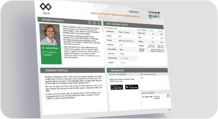 FINTECH Debit Card Payment System for Cryptocurrencies SPEAKER PROFILE KEY COMPANY FACTS • After his successful career as a professional kitesurfer Key Corporate Facts Traffic Apr-17 Apr-18 (ranking among top 10 in the world) and later as a Headquarters Singapore, Singapore Unique Users 6k 100k trauma surgeon, Julian became a serial entrepreneur, bestselling author and keynote-speaker Founded 2015 Visits 14k 224k • He co-founded the Singapore based FinTech company TenX, which has developed a technology Funding $80m (Initial Coin Offering) Minutes 03:17 02:27 that makes cryptocurrencies spendable anytime anywhere and has raised USD $80 million in its initial Employees 11-25 Mobile: 0% Mobile: 33% token sale in June 2017 Sessions Desktop: 100% Desktop: 64% • Julian was named one of the top Blockchain and Active Markets Global Apr 2018 Direct: 33%, Search: 34%, Dr. Julian Hosp Cryptocurrency experts. He is a frequently invited Sources Referrals: 20%, Other: 13% speaker at global Tech/FinTech events as well as a Co-Founder & regular commentator in the media on current Ownership Private President blockchain trends, the future of cryptocurrency and best ICO practices NOAH Content TenX at NOAH Website tenx.tech COMPANY PROFILE TENX@ NOAH Doing Business @ NOAH Main Presentation Topics • Founded in Singapore in 2015, TenX is the only company worldwide that makes multiple digital currencies spendable anytime anywhere by offering a debit card Present your business proposal through N/A payment system to its users. It has raised $80 million in its initial token sale and NOAH Connect app made it to the top 5 Singapore’s best funded startups in 2017 • The user can spend any of the funds through the TenX debit card, which can be used in almost 200 countries at over 36 million points of acceptance online and offline • In order to offer the widest range of cryptocurrencies, TenX is working on the Cryptographically-secure Off-chain Multi-asset Instant Transaction network Attendees @ NOAH (COMIT) to connect all the blockchains Dr. Julian Hosp, Co-Founder & President 109