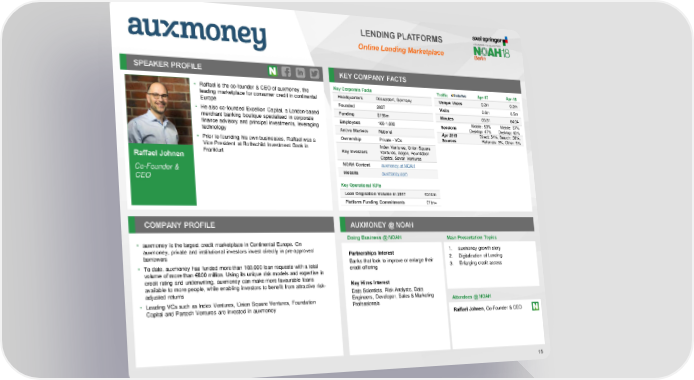 LENDING PLATFORMS Online Lending Marketplace SPEAKER PROFILE KEY COMPANY FACTS • Raffael is the co-founder & CEO of auxmoney, the Key Corporate Facts Traffic Apr-17 Apr-18 leading marketplace for consumer credit in continental Headquarters Düsseldorf, Germany Unique Users 0.2m 0.2m Europe Founded 2007 Visits 0.6m 0.5m • He also co-founded Excellion Capital, a London-based Funding $198m Minutes 05:31 04:34 merchant banking boutique specialised in corporate Employees 100-1,000 Mobile: 53% Mobile: 57% finance advisory and principal investments, leveraging Sessions Desktop: 47% Desktop: 43% technology Active Markets National Apr 2018 Direct: 54%, Search: 38%, • Prior to founding his own businesses, Raffael was a Ownership Private - VCs Sources Referrals: 3%, Other: 5% Vice President at Rothschild Investment Bank in Index Ventures, Union Square Frankfurt Key Investors Ventures, Aegon, Foundation Capital, Seven Ventures Raffael Johnen Co-Founder & NOAH Content auxmoney at NOAH CEO Website auxmoney.com Key Operational KPIs Loan Origination Volume in 2017 €316m Platform Funding Commitments €1bn+ COMPANY PROFILE AUXMONEY @ NOAH Doing Business @ NOAH Main Presentation Topics • auxmoney is the largest credit marketplace in Continental Europe. On auxmoney, private and institutional investors invest directly in pre-approved 1. auxmoney growth story borrowers Partnerships Interest 2. Digitalization of Lending • To date, auxmoney has funded more than 100,000 loan requests with a total Banks that look to improve or enlarge their 3. Enlarging credit access credit offering volume of more than €800 million. Using its unique risk models and expertise in credit rating and underwriting, auxmoney can make more favourable loans available to more people, while enabling investors to benefit from attractive risk- Key Hires Interest adjusted returns Data Scientists, Risk Analysts, Data • Leading VCs such as Index Ventures, Union Square Ventures, Foundation Engineers, Developer, Sales & Marketing Professionals Attendees @ NOAH Capital and Partech Ventures are invested in auxmoney Raffael Johnen, Co-Founder & CEO 15