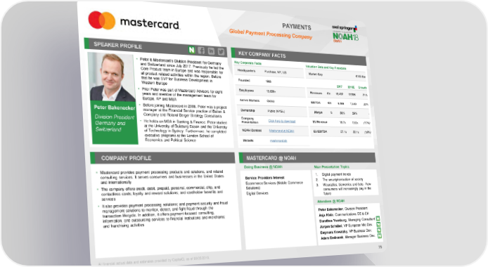 PAYMENTS Global Payment Processing Company SPEAKER PROFILE KEY COMPANY FACTS Key Corporate Facts Valuation Data and Key Financials • Peter is Mastercard’s Division President for Germany and Switzerland since July 2017. Previously he led the Headquarters Purchase, NY, US Market Cap €165.6bn Core Product team in Europe and was responsible for all product related activities within the region. Before Founded 1966 that he was SVP for Business Development in 2017 2018E Growth Western Europe • Prior Peter was part of Mastercard Advisors for eight Employees 13,000+ Revenues €m 10,432 12,596 21% years and member of the management team for Active Markets Global EBITDA €m 6,066 7,440 23% Europe, AP and MEA • Before joining Mastercard in 2006, Peter was a project Ownership Public (NYSE) Margin % 58% 59% - Peter Bakenecker manager at the Financial Service practice of Batten & Company and Roland Berger Strategy Consultants Division President Company Click here to download EV/Revenue 15.7x 13.0x (17%) Germany and • He holds an MBA in Banking & Finance. Peter studied Presentation at the University of Duisburg-Essen and the University EV/EBITDA 27.1x 22.1x (18%) Switzerland of Technology in Sydney. Furthermore, he completed NOAH Content Mastercard at NOAH executive programs at the London School of Economics and Political Science Website mastercard.de COMPANY PROFILE MASTERCARD @ NOAH Doing Business @ NOAH Main Presentation Topics • Mastercard provides payment processing products and solutions, and related consulting services. It serves consumers and businesses in the United States 1. Digital payment trends and internationally Service Providers Interest 2. The smartphonisation of society • The company offers credit, debit, prepaid, personal, commercial, chip, and Ecommerce Services (Mobile Commerce 3. Wearables, biometrics and bots - how contactless cards; loyalty and reward solutions; and cardholder benefits and Solutions) consumers will increasingly pay in the services Digital Services future • It also provides payment processing solutions; and payment security and fraud management solutions to monitor, detect, and fight fraud through the Attendees @ NOAH transaction lifecycle. In addition, it offers payment-focused consulting, Peter Bakenecker, Division President information, and outsourcing services to financial institutions and merchants; Anja Klein, Communications DE & CH and franchising activities Dorothea Ysenburg, Managing Consultant Jürgen Schübel, VP European Mkt Dev. Dagmara Kowatzky, VP Business Dev. Adam Bednarek, Manager Business Dev. All financial actual data and estimates provided by CapitaIQ, as of 08/05/2018. 75