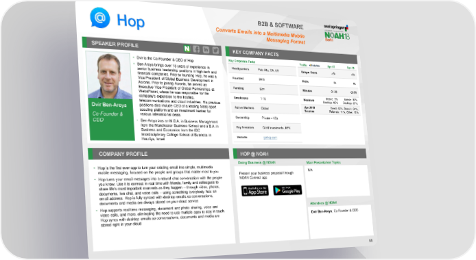 B2B & SOFTWARE Converts Emails into a Multimedia Mobile Messaging Format SPEAKER PROFILE KEY COMPANY FACTS • Dvir is the Co-Founder & CEO of Hop Key Corporate Facts Traffic Apr-17 Apr-18 • Ben-Aroya brings over 15 years of experience in Headquarters Palo Alto, CA, US Unique Users <5k <5k senior business leadership positions in high-tech and financial companies. Prior to founding Hop, he was a Founded 2013 Visits 8k 9k Vice President of Global Business Development in Acronis. Prior to joining Acronis, he served as Funding $2m Minutes 01:26 00:55 Executive Vice President of Global Partnerships at WebsPlanet, where he was responsible for the Mobile: 5% Mobile: 33% Employees 1-10 Sessions company’s expansion to the hosting, Desktop: 95% Desktop: 67% telecommunications and cloud industries. His previous Apr 2018 Direct: 43%, Search: 34%, positions also include CEO of a leading SaaS sport Active Markets Global Dvir Ben-Aroya scouting platform and an investment banker for Sources Referrals: 11%, Other: 12% Co-Founder & various international deals. Ownership Private – VCs CEO • Ben-Aroya has an M.B.A. in Business Management from the Manchester Business School and a B.A. in Key Investors Cubit Investments, NFX Business and Economics from the IDC Interdisciplinary College School of Business in Website gethop.com Herzliya, Israel COMPANY PROFILE HOP @ NOAH Doing Business @ NOAH Main Presentation Topics • Hop is the first ever app to turn your existing email into simple, multimedia mobile messaging, focused on the people and groups that matter most to you Present your business proposal through N/A • Hop turns your email messages into a natural chat conversation with the people NOAH Connect app you know. Use it to connect in real time with friends, family and colleagues to share life’s most important moments as they happen -- through video, photos, documents, live chat, and voice calls -- using something everybody has: an email address. Hop is fully synced with desktop emails so conversations, documents and media are always stored on your cloud service • Hop supports real-time messaging, document and photo sharing, voice and Attendees @ NOAH video calls, and more, eliminating the need to use multiple apps to stay in touch. Hop syncs with desktop emails so conversations, documents and media are Dvir Ben-Aroya, Co-Founder & CEO stored right in your cloud 58