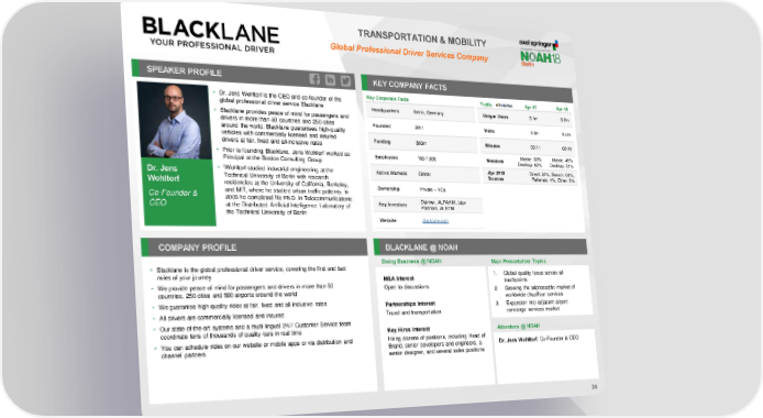TRANSPORTATION & MOBILITY Global Professional Driver Services Company SPEAKER PROFILE KEY COMPANY FACTS • Dr. Jens Wohltorf is the CEO and co-founder of the Key Corporate Facts Traffic Apr-17 Apr-18 global professional driver service Blacklane Headquarters Berlin, Germany Unique Users 0.1m 0.2m • Blacklane provides peace of mind for passengers and drivers in more than 50 countries and 250 cities Founded 2011 Visits 0.3m 0.4m around the world. Blacklane guarantees high-quality vehicles with commercially licensed and insured Funding $83m Minutes 02:11 02:43 drivers at fair, fixed and all-inclusive rates • Prior to founding Blacklane, Jens Wohltorf worked as Mobile: 38% Mobile: 49% Principal at the Boston Consulting Group Employees 100-1,000 Sessions Desktop: 62% Desktop: 51% • \Wohltorf studied industrial engineering at the Active Markets Global Apr 2018 Direct: 24%, Search: 64%, Dr. Jens Technical University of Berlin with research Sources Referrals: 4%, Other: 8% Wohltorf residencies at the University of California, Berkeley, Ownership Private – VCs Co-Founder & and MIT, where he studied urban traffic patterns. In 2005 he completed his Ph.D. in Telecommunications Daimler, ALFAHIM, btov CEO at the Distributed Artificial Intelligence Laboratory of Key Investors Partners, ALSTIN the Technical University of Berlin Website blacklane.com COMPANY PROFILE BLACKLANE @ NOAH Doing Business @ NOAH Main Presentation Topics • Blacklane is the global professional driver service, covering the first and last miles of your journey 1. Global quality focus across all M&A Interest touchpoints • We provide peace of mind for passengers and drivers in more than 50 Open to discussions 2. Growing the addressable market of countries, 250 cities and 500 airports around the world worldwide chauffeur services • We guarantee high-quality rides at fair, fixed and all-inclusive rates Partnerships Interest 3. Expansion into adjacent airport • All drivers are commercially licensed and insured Travel and transportation concierge services market • Our state-of-the-art systems and a multi-lingual 24/7 Customer Service team coordinate tens of thousands of quality cars in real time Key Hires Interest Attendees @ NOAH • You can schedule rides on our website or mobile apps or via distribution and Hiring dozens of positions, including Head of Dr. Jens Wohltorf, Co-Founder & CEO channel partners Brand, senior developers and engineers, a senior designer, and several sales positions 24