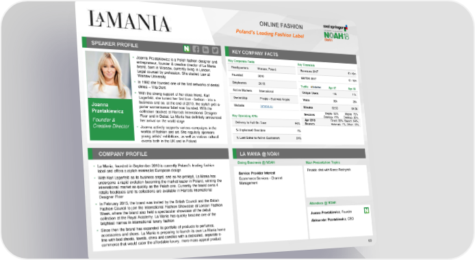 ONLINE FASHION Poland’s Leading Fashion Label SPEAKER PROFILE KEY COMPANY FACTS • Joanna Przetakiewicz is a Polish fashion designer and Key Corporate Facts Key Financials entrepreneur, founder & creative director of La Mania Headquarters Warsaw, Poland Revenues 2017 €1-10m brand, born in Warsaw, currently living in London. Legal counsel by profession. She studied Law at Founded 2010 EBITDA 2017 €1-10m Warsaw University Employees 26-50 • In 1992 she founded one of the first networks of dental Traffic Apr-17 Apr-18 clinics – Vita Dent Active Markets International Unique Users 14k 11k • With the strong support of her close friend, Karl Ownership Private – Business Angels Visits 30k 29k Lagerfeld, she turned her first love - fashion - into a business and so, at the end of 2010, the stylish prêt-a- Website lamania.eu Minutes 02:50 04:06 Joanna porter womenswear label was founded. With the Mobile: 56% Mobile: 70% collection stocked at Harrods International Designer Sessions Przetakiewicz Desktop: 44% Desktop: 30% Floor and in Dubai, La Mania has definitely announced Key Operating KPIs Apr 2018 Direct: 22%, Search: 64%, Founder & her arrival on the world stage Delivery In Full On Time 96% Sources Referrals: 1%, Other: 13% Creative Director • Joanna actively supports various campaigns in the % Unplanned Overtime 4% worlds of fashion and art. She regularly sponsors young artists’ exhibitions, as well as various cultural % Lost Sales to Active Customers 24% events both in the UK and in Poland COMPANY PROFILE LA MANIA @ NOAH Doing Business @ NOAH Main Presentation Topics • La Mania, founded in September 2010 is currently Poland’s leading fashion label and offers a stylish minimalist European design Fireside chat with Marco Rodzynek • With Karl Lagerfeld as its business angel, and as his protégé, La Mania has Service Provider Interest undergone a rapid evolution becoming the market leader in Poland, winning the Ecommerce Services - Channel international market as quickly as the Polish one. Currently the brand owns 4 Management retails boutiques and its collections are available in Harrods International Designer Floor • In February 2015, the brand was invited by the British Council and the British Fashion Council to join the International Fashion Showcase at London Fashion Week, where the brand also held a spectacular showcase of the debut Attendees @ NOAH collection at the Royal Academy. La Mania has quickly become one of the Joanna Przetakiewicz, Founder brightest names in international luxury fashion • Since then the brand has expanded its portfolio of products to perfumes, Aleksander Przetakiewicz, CEO accessories and shoes. La Mania is preparing to launch its own La Mania home line with bed sheets, towels, china and candles with a dedicated, separate e- commerce that would cater the affordable luxury, more mass appeal product 69