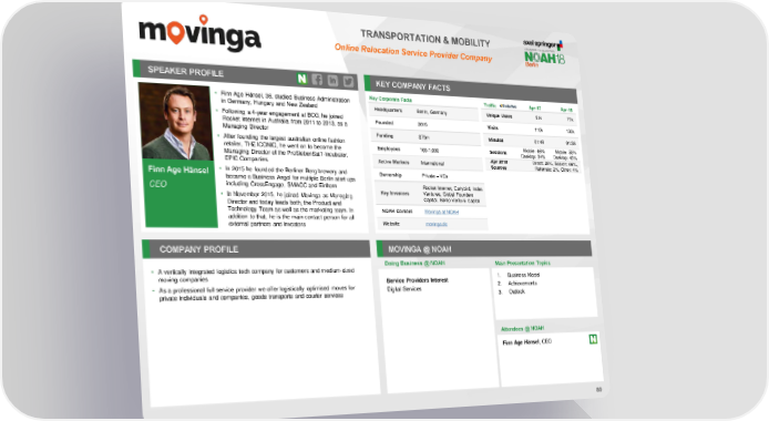 TRANSPORTATION & MOBILITY OnlineRelocation Service Provider Company SPEAKER PROFILE KEY COMPANY FACTS • Finn Age Hänsel, 36, studied Business Administration Key Corporate Facts Traffic Apr-17 Apr-18 in Germany, Hungary and New Zealand Headquarters Berlin, Germany Unique Users 51k 77k • Following a 4-year engagement at BCG, he joined Founded 2015 Visits 110k 133k Rocket Internet in Australia from 2011 to 2013, as a Managing Director Funding $76m Minutes 01:48 01:58 • After founding the largest australian online fashion Mobile: 66% Mobile: 55% retailer, THE ICONIC, he went on to become the Employees 100-1,000 Sessions Desktop: 34% Desktop: 45% Managing Director of the ProSiebenSat1-Incubator, Active Markets International Apr 2018 Direct: 28%, Search: 66%, EPIC Companies. Sources Referrals: 2%, Other: 4% • In 2015 he founded the Berliner Berg brewery and Ownership Private – VCs Finn Age Hänsel became a Business Angel for multiple Berlin start-ups CEO including CrossEngage, SMACC and Einhorn Rocket Internet, Earlybird, Index • In November 2015, he joined Movinga as Managing Key Investors Ventures, Global Founders Director and today leads both, the Product and Capital, Santo Venture Capital Technology Team as well as the marketing team. In NOAH Content Movinga at NOAH addition to that, he is the main contact person for all external partners and investors Website movinga.de COMPANY PROFILE MOVINGA@ NOAH Doing Business @ NOAH Main Presentation Topics • A vertically integrated logistics tech company for customers and medium-sized moving companies 1. Business Model Service Providers Interest 2. Achievements • As a professional full service provider we offer logistically optimised moves for Digital Services private individuals and companies, goods transports and courier services 3. Outlook Attendees @ NOAH Finn Age Hänsel, CEO 80