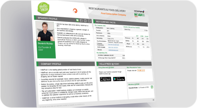RESTAURANTS & FOOD DELIVERY FoodSubscription Company SPEAKER PROFILE KEY COMPANY FACTS • Dominik has been CEO since starting HelloFresh in Key Corporate Facts Valuation Data and Key Financials 2011 Headquarters Berlin, Germany Market Cap €1.8bn • He is responsible for keeping a general oversight of Founded 2011 the business and strategy Employees 3,500+ 2017 2018E Growth • Dominik’s an entrepreneur to the core and started his Active Markets Global first two businesses while still at university. Revenues €m 905 1,204 33% • Dominik graduated from WHU with a degree in Ownership Public (ETR) International Business in 2009, and from the London Rocket Internet, Insight, EBITDA €m (81) (52) (36%) School of Economics in 2010 with a Masters in Key Shareholders Phenomen, Vanguard, Vorwerk Margin % (9%) (4%) - Finance and has worked for Goldman Sachs before Company Click here to download Presentation Dominik Richter founding HelloFresh EV/Revenue 1.7x 1.3x (25%) Co-Founder & NOAH Content HelloFresh at NOAH CEO Website hellofreshgroup.com Key Operating KPIs US Active Customers Q4 2017 0.9m US Average Order Value Q4 2017 €49.5 COMPANY PROFILE HELLOFRESH @ NOAH Doing Business @ NOAH Main Presentation Topics • HelloFresh is the leading global provider of fresh food at home • HelloFresh aims to provide each and every household in its 9 markets with the Present your business proposal through Fireside chat with opportunity to enjoy wholesome home-cooked meals with no planning, no NOAH Connect app shopping and no hassle required • Everything required for weeknight meals, carefully planned, locally sourced and delivered to your door at the most convenient time for each subscriber • Behind the scenes, a huge data driven technology platform puts us in the prime position for disrupting the food supply chain and for fundamentally changing the way consumers shop for food Attendees @ NOAH • The soft subscription model business enables us to leverage our weekly Dominik Richter, Co-Founder & CEO subscriber touch points to consistently manage supply chains and demand, and to optimise the customer experience as well as our business economics • HelloFresh is at the forefront of disrupting a multi trillion dollar industry at the very beginning of its online transition All financial actual data and estimates provided by CapitaIQ, as of 06/05/2018. 55