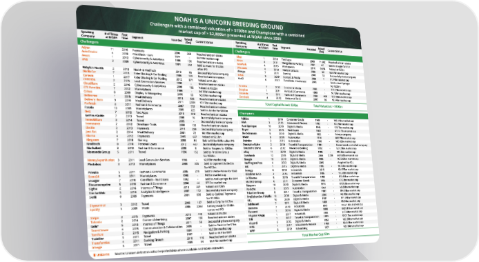 NOAH IS A UNICORN BREEDING GROUND Challengers with a combined valuation of > $150bn and Champions with a combined market cap of > $2,800bn presented at NOAH since 2009 Speaking # of Times First Segment Founded Raised Current Status Speaking # of Times First Segment Founded Raised Current Status Company at NOAH Time ($m) Company at NOAH Time ($m) Challengers Challengers Adyen 11 2010 Payments 2006 266 Reached unicorn status Uber 1 2016 Taxi Apps 2009 11,562 Reached unicorn status AutoTrader 4 2010 Classifieds - Cars 1977 - $4.74bn market cap Waze 3 2011 Navigation & Parking 2007 67 Sold to Google for $1.1 Avast 1 2012 Cybersecurity & Anti-Virus 1988 100 Reached unicorn status WeWork 4 2015 Workspaces 2010 9,854 Valued at $20bn AVG 2 2009 Cybersecurity & Anti-Virus 1991 252 Sold to Avast for $1.3bn Wix.com 4 2012 Horizontal SaaS 2006 59 $3.07bn market cap after IPO Wooga 7 2011 Gaming 2009 32 Successful private company Babylon Health 2 2013 Health & MedTech 2013 85 Successful private company XING 9 2009 Content & Media 2003 7 $1.74bn market cap BlaBlaCar 7 2013 Rider Sharing & Car Pooling 2006 335 Reached unicorn status Yad2 6 2012 Classifieds - Horizontal 2005 - Sold to Axel Springer Careem 1 2017 Rider Sharing & Car Pooling 2012 571 Valued at $1.2bn for $228m CHECK24 2 2015 Lead Generation Services 1999 - Reached unicorn status Yandex 7 2012 Content & Media 2000 - $10.23bn market cap Cloudflare 2 2016 Cybersecurity & Anti-Virus 2009 182 Valued at $3.2bn Zooplus 1 2011 Vertical E-Commerce 1999 - $1.13bn market cap CTS Eventim 7 2012 Marketplaces 1999 - $4.11bn market cap Zalando 7 2011 Fashion E-Commerce 2008 468 $12.92bn market cap Criteo 8 2009 Display & Retargeting 2005 63 $2.89bn market cap Zendesk 4 2012 Horizontal SaaS 2007 86 $2.94bn market cap Deliveroo 1 2015 Meal Delivery 2013 860 Reached unicorn status Delivery Hero 9 2010 Meal Delivery 2011 2,581 $7.17bn market cap Total Capital Raised: $34bn Total Valuation: > $150bn Farfetch 2 2011 Fashion E-Commerce 2007 702 Reached unicorn status Fotolia 10 2009 Marketplaces 2005 225 Sold to Adobe for $800m Champions Gett 7 2012 Taxi Apps 2010 613 Reached unicorn status GetYourGuide 7 2013 Travel 2008 96 Successful private company Adidas 1 2016 Consumer Goods 1949 - $48.14bn market cap Immobiliare 3 2014 Travel 2005 - Successful private company AXA 3 2015 Insurance & Finance 1982 - $72.8bn market cap Ironsource 2 2012 Developer Tools 2009 105 Reached unicorn status Axel Springer 10 2010 Digital & Media 1946 - $7.17bn market cap iZettle 2 2013 Payments 2010 269 Successful private company Bayer 3 2015 Healthcare 1863 - $114.17bn market cap Just Eat 2 2014 Meal Delivery 2001 72 $6.16bn market cap Bertelsmann 9 2010 Digital & Media 1835 - Private company Klarna 4 2012 Payments 2005 637 Valued at $2.5bn BMW 3 2015 Automotive 1916 - $67.79bn market cap King.com 7 2010 Gaming 2003 84 Sold to EA for $5.9bn after IPO Daimler 3 2015 Automotive 1998 - $85.82bn market cap Kreditech 8 2010 Personal Loans 2012 497 Successful private company Deutsche Bahn 2 2015 Travel & Transportation 1994 - Government controlled company Markafoni 2 2012 Fashion E-Commerce 2008 8 Sold to Naspers for $200m Deutsche Börse 6 2012 Finance & Banking 1992 - $21.29bn market cap Momondo Group 5 2011 Travel 1996 152 Sold to Priceline Group eBay 11 2010 Digital & Media 1995 - $40.3bn market cap for $550m Facebook 12 2009 Digital & Media 2004 2.336 $498.65bn market cap MoneySuperMarket 3 2011 Lead Generation Services 1993 - $2.86bn market cap Google 10 2010 Digital & Media 1998 - $678.60bn market cap Photobox 3 2013 Marketplaces 2000 305 Sold to Exponent & Electra Huffington Post 4 2012 Digital & Media 2005 - Acquired by AOL for $615m IAC 1 2015 Digital & Media 1995 - $9.76bn market cap Privalia 5 2011 Fashion E-Commerce 2006 219 Sold to Vente-Privee for $560 innogy 6 2014 Industrials 2015 - $24.97bn market cap Scout24 9 2011 Marketplaces 1998 - $4.3bn market cap Klöckner & Co 3 2016 Industrials 1906 - $1.20bn market cap SeLoger 7 2010 Classifieds - Real Estate 1992 - Sold to Axel Springer for $847 Lufthansa 5 2015 Travel & Transportation 1953 - $13.64bn market cap Showroomprive 8 2010 Fashion E-Commerce 2006 44 $717m market cap METRO Group 6 2011 Consumer Goods 1996 - $7.33bn market cap Sigfox 2 2016 Internet of Things 2010 327 Valued at $708m Naspers 10 2010 Digital & Media 1915 - $103.4bn market cap SimilarWeb 5 2014 Analytics & Intelligence 2007 112 Successful private company Porsche 5 2015 Automotive 1931 - $9.88bn market cap Skrill 6 2009 Payments 2001 800 Sold to Optimal Payments Priceline Group 8 2011 Travel & Transportation 1997 - $94.18bn market cap for $1.98bn ProSiebenSat.1 Media 10 2010 Digital & Media 2000 - $8.16bn market cap Skyscanner 3 2012 Travel 2003 197 Sold to Ctrip for $1.7bn RTL 10 2009 Digital & Media 1931 - $11.74bn market cap Spotify 5 2009 Music 2006 2,563 Getting ready for $16bn Schibsted 7 2011 Digital & Media 1839 - $5.64bn market cap rumoured IPO Siemens 7 2013 Industrials 1847 - $127.19bn market cap Stripe 3 2015 Payments 2010 440 Valued at $9.2bn Tencent 1 2014 Digital & Media 1898 - $429.81bn market cap Taboola 2 2014 Content Advertising 2007 160 Reached unicorn status ThyssenKrupp 1 2017 Industrials 1999 - $17.00bn market cap tado° 6 2013 Internet of Things 2011 56 Successful private company TUI 1 2017 Travel & Transportation 1923 - $10.17bn market cap TeamViewer 4 2015 Communication & Collaboration 2005 - Sold to Permira for $1bn Vivendi 3 2012 Digital & Media 1853 - $32.50bn market cap TomTom 2 2015 Navigation & Parking 1991 - $2.55bn market cap VISA 1 2017 Insurance & Finance 1958 - $245.9bn market cap Trainline 3 2011 Travel 1997 - Sold to KKR for $681 WPP 5 2012 Advertising 1971 - $23.36bn market cap Transferwise 4 2011 Banking Fintech 2010 116 Reached unicorn status Total Market Cap: $3tn trivago 5 2011 Travel 2005 54 $3.17bn market cap Unicorns Source: Unicorn definition actual reported data where available and NOAH estimates.
