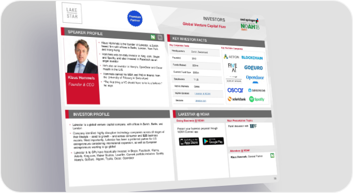 INVESTORS Premium Partner Global Venture Capital Firm SPEAKER PROFILE KEY INVESTORFACTS • Klaus Hommels is the founder of Lakestar, a Zurich- Key Corporate Facts Key Portfolio Companies based firm with offices in Berlin, London, New York Headquarters Zurich, Switzerland and Hong Kong • Hommels was an early investor in King. com, Skype Founded 2012 and Spotify, and also invested in Facebook as an angel investor Funds Raised $534m • He's also an investor in Harry's, OpenDoor and Oscar Health in the U.S. Current Fund Size $385m • Hommels earned his MBA and PhD in finance from the University of Fribourg in Switzerland Employees 11-25 Klaus Hommels Founder & CEO • "The first thing a VC should have to be is a believer," Active Markets Global he says NOAH Content Lakestar at NOAH Website lakestar.com INVESTORPROFILE LAKESTAR @ NOAH Doing Business @ NOAH Main Presentation Topics • Lakestar is a global venture capital company, with offices in Zurich, Berlin, and London Present your business proposal through Panel discussion with • Company identified highly disruptive technology companies across all stages of NOAH Connect app their lifestyle – seed to growth – and across consumer and B2B business models. Most importantly, Lakestar has been a preferred partner for US entrepreneurs considering international expansion, as well as European entrepreneurs wanting to go global • Lakestar & its GPs have historically invested in Skype, Facebook, Klarna, Airbnb, King.com, Maker Studios, Lovefilm. Current portfolio includes: Spotify, Attendees @ NOAH Harry’s, GoEuro, Algomi, Taulia, Oscar, Opendoor Klaus Hommels, General Partner 70