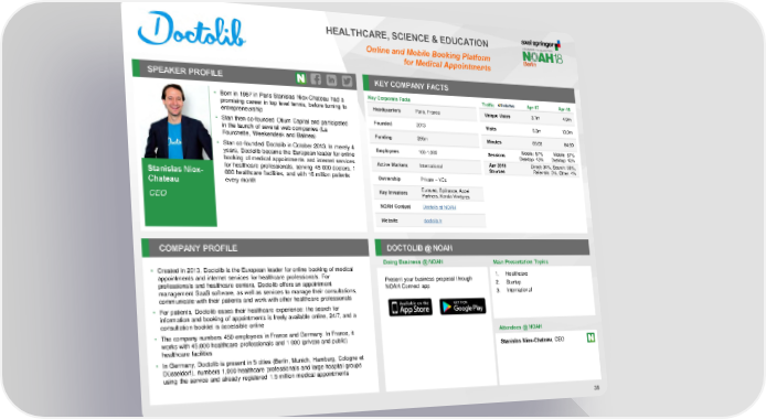 HEALTHCARE, SCIENCE & EDUCATION Online and Mobile Booking Platform for Medical Appointments SPEAKER PROFILE KEY COMPANY FACTS • Born in 1987 in Paris Stanislas Niox-Chateau had a Key Corporate Facts Traffic Apr-17 Apr-18 promising career in top level tennis, before turning to Headquarters Paris, France Unique Users 3.1m 4.9m entrepreneurship • Stan then co-founded Otium Capital and participated Founded 2013 Visits 6.2m 10.0m in the launch of several web companies (La Funding $96m Minutes 05:03 04:50 Fourchette, Weekendesk and Balinea) • Stan co-founded Doctolib in October 2013. In merely 4 Employees 100-1,000 Mobile: 57% Mobile: 57% years, Doctolib became the European leader for online Sessions Desktop: 43% Desktop: 43% booking of medical appointments and internet services Active Markets International Apr 2018 Direct: 34%, Search: 60%, for healthcare professionals, serving 45 000 doctors, 1 Sources Referrals: 3%, Other: 4% Stanislas Niox- 000 healthcare facilities, and with 16 million patients Ownership Private – VCs every month Chateau Eurazeo, Bpifrance, Accel CEO Key Investors Partners, Kerala Ventures NOAH Content Doctolib at NOAH Website doctolib.fr COMPANY PROFILE DOCTOLIB @ NOAH Doing Business @ NOAH Main Presentation Topics • Created in 2013, Doctolib is the European leader for online booking of medical appointments and internet services for healthcare professionals. For Present your business proposal through 1. Healthcare professionals and healthcare centers, Doctolib offers an appointment NOAH Connect app 2. Startup management SaaS software, as well as services to manage their consultations, 3. International communicate with their patients and work with other healthcare professionals • For patients, Doctolib eases their healthcare experience: the search for information and booking of appointments is freely available online, 24/7, and a consultation booklet is accessible online • The company numbers 450 employees in France and Germany. In France, it Attendees @ NOAH works with 45,000 healthcare professionals and 1 000 (private and public) healthcare facilities Stanislas Niox-Chateau, CEO • In Germany, Doctolib is present in 5 cities (Berlin, Munich, Hamburg, Cologne et Düsseldorf), numbers 1,000 healthcare professionals and large hospital groups using the service and already registered 1.5 million medical appointments 38