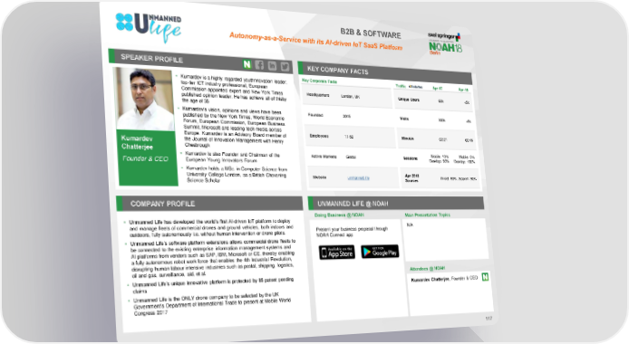B2B & SOFTWARE Autonomy-as-a-Service with its AI-driven IoT SaaS Platform SPEAKER PROFILE KEY COMPANY FACTS • Kumardev is a highly regarded youthnnovation leader, Key Corporate Facts Traffic Apr-17 Apr-18 top-tier ICT industry professional, European Commission appointed expert and New York Times Headquarters London, UK Unique Users 68k <5k published opinion leader. He has achieve all of thisby the age of 35 • Kumardev’s vision, opinions and views have been Founded 2015 Visits 309k <5k published by the New York Times, World Economic Forum, European Commission, European Business Summit, Microsoft and leading tech media across Europe. Kumardev is an Advisory Board member of Employees 11-50 Minutes 02:21 00:48 the Journal of Innovation Management with Henry Kumardev Chesbrough Chatterjee Mobile: 10% Mobile: 0% • Kumardev is also Founder and Chairman of the Active Markets Global Sessions Desktop: 90% Desktop: 100% Founder & CEO European Young Innovators Forum • Kumardev holds a MSc. in Computer Science from University College London, as a British Chevening Website unmanned.life Apr 2018 Direct: 50%, Search: 50% Science Scholar Sources COMPANY PROFILE UNMANNED LIFE @ NOAH Doing Business @ NOAH Main Presentation Topics • Unmanned Life has developed the world’s first AI-driven IoT platform to deploy and manage fleets of commercial drones and ground vehicles, both indoors and Present your business proposal through N/A outdoors, fully autonomously i.e. without human intervention or drone pilots. NOAH Connect app • Unmanned Life’s software platform extensions allows commercial drone fleets to be connected to the existing enterprise information management systems and AI platforms from vendors such as SAP, IBM, Microsoft or GE, thereby enabling a fully autonomous robot work force that enables the 4th Industrial Revolution, disrupting human labour intensive industries such as postal, shipping, logistics, oil and gas, surveillance, aid, et al. Attendees @ NOAH • Unmanned Life’s unique innovative platform is protected by 85 patent pending claims Kumardev Chatterjee, Founder & CEO • Unmanned Life is the ONLY drone company to be selected by the UK Government's Department of International Trade to present at Mobile World Congress 2017 117