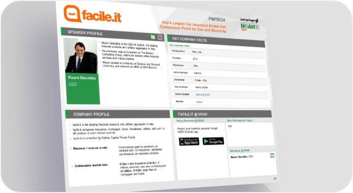 FINTECH Italy's Largest Car Insurance Broker and Comparison Portal for Gas and Electricity SPEAKER PROFILE KEY COMPANY FACTS • Mauro Giacobbe is the CEO of facile.it, the leading Key Corporate Facts financial products and utilities aggregator in Italy Headquarters Milan, Italy • He previously was a Consultant at The Boston Consulting Group, where he worked within financial Founded 2010 services and media practice • Mauro studied at University of Genova and Bocconi Employees 200+ University and obtained an MBA at SDA Bocconi Active Markets National Ownership Private – VCs Mauro Giacobbe CEO Key Investors Oakley Capital NOAH Content facile.it at NOAH Website facile.it COMPANY PROFILE FACILE.IT @ NOAH Doing Business @ NOAH Main Presentation Topics • facile.it is the leading financial products and utilities aggregator in Italy • facile.it compares insurance, mortgages, loans, broadband, utilities, with a #1 or Present your business proposal through N/A #2 position in each vertical covered NOAH Connect app • facile.it is controlled by Oakley Capital Private Equity • Business / revenue model: Commissions paid by providers on contract sold. On insurance, additional commissions on renewed contracts Attendees @ NOAH Mauro Giacobbe, CEO • Addressable market size: €16bn motor insurance premium, 4 millions switchers and new contracts/year on utilities, €>55bn /year flow on mortgages and loans 46
