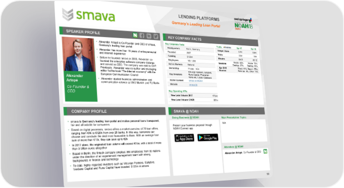LENDING PLATFORMS Germany’s Leading Loan Portal SPEAKER PROFILE KEY COMPANY FACTS • Alexander Artopé is Co-Founder and CEO of smava, Key Corporate Facts Traffic Apr-17 Apr-18 Headquarters Berlin, Germany Unique Users 0.4m 0.9m Germany’s leading loan portal • Alexander has more than 18 years of entrepreneurial Founded 2007 Visits 0.6m 1.6m and Internet experience Funding $128m Minutes 04:07 03:12 • Before he founded smava in 2006, Alexander co- Employees 100-1,000 Mobile: 63% Mobile: 78% founded the enterprise software company datango Sessions Desktop: 37% Desktop: 22% Active Markets National Apr 2018 Direct: 44%, Search: 35%, and served as CEO. The company was sold to SAP. Ownership Private - VCs Sources Referrals: 8%, Other: 13% Previously, Alexander was co-author and managing Vitruvian Partners, Earlybird, editor for the book “The internet economy” with the Runa Capital, Phenomen European Communication Council Key Investors Ventures, Lukasz Gadowski Alexander • Alexander studied business administration and NOAH Content smava at NOAH Artopé communication science at LMU Munich and FU Berlin Website smava.de Co-Founder & CEO Key Operating KPIs New Loan Volume 2017 €1bn+ New Loan Volume CAGR 80%+ COMPANY PROFILE SMAVA @ NOAH Doing Business @ NOAH Main Presentation Topics • smava is Germany’s leading loan portal and makes personal loans transparent, fair and affordable for consumers Present your business proposal through N/A • Based on digital processes, smava offers a market overview of 70 loan offers, NOAH Connect app ranging from €1k to €120k from over 25 banks. In this way, borrowers can choose and conclude the deal most favourable to them. With an average loan sum of more than €10k, they can save up to €2k • In 2017 alone, the originated loan volume will exceed €1bn, with a total of more than 3 billion euros altogether • Based in Berlin, the fintech company employs 300 employees from 30 nations Attendees @ NOAH under the direction of an experienced management team with strong Alexander Artopé, Co-Founder & CEO backgrounds in finance and technology • To date, highly regarded investors such as Vitruvian Partners, Earlybird, Verdane Capital and Runa Capital have invested $128m in smava 99