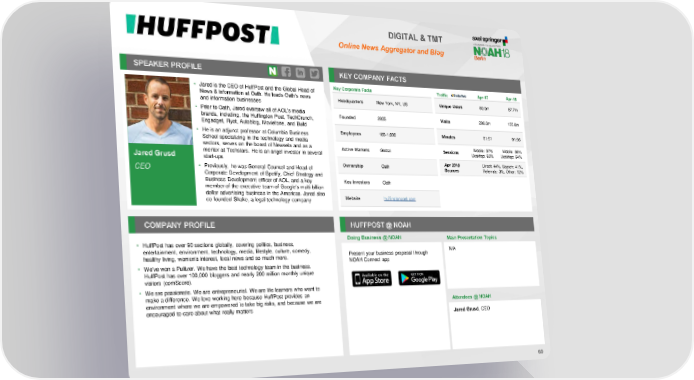 DIGITAL & TMT OnlineNewsAggregatorand Blog SPEAKER PROFILE KEY COMPANY FACTS • Jared is the CEO of HuffPost and the Global Head of Key Corporate Facts Traffic Apr-17 Apr-18 News & Information at Oath. He leads Oath’s news Headquarters New York, NY, US Unique Users 80.0m 57.7m and information businesses • Prior to Oath, Jared oversaw all of AOL’s media Founded 2005 Visits 206.0m 137.6m brands, including, the Huffington Post, TechCrunch, Engadget, Ryot, Autoblog, Moviefone, and Build • He is an adjunct professor at Columbia Business Employees 100-1,000 Minutes 01:51 01:56 School specializing in the technology and media sectors, serves on the board of Newsela and as a Mobile: 37% Mobile: 36% mentor at Techstars. He is an angel investor in several Active Markets Global Sessions Desktop: 63% Desktop: 64% Jared Grusd start-ups Apr 2018 Direct: 44%, Search: 41%, CEO • Previously, he was General Counsel and Head of Ownership Oath Sources Referrals: 3%, Other: 12% Corporate Development of Spotify, Chief Strategy and Business Development officer of AOL, and a key Key Investors Oath member of the executive team of Google's multi-billion dollar advertising business in the Americas. Jared also co-founded Shake, a legal technology company Website huffingtonpost.com COMPANY PROFILE HUFFPOST @ NOAH Doing Business @ NOAH Main Presentation Topics • HuffPost has over 90 sections globally, covering politics, business, entertainment, environment, technology, media, lifestyle, culture, comedy, Present your business proposal through N/A healthy living, women's interest, local news and so much more. NOAH Connect app • We've won a Pulitzer. We have the best technology team in the business. HuffPost has over 100,000 bloggers and nearly 200 million monthly unique visitors (comScore). • We are passionate. We are entrepreneurial. We are life learners who want to make a difference. We love working here because HuffPost provides an environment where we are empowered to take big risks, and because we are Attendees @ NOAH encouraged to care about what really matters Jared Grusd, CEO 60