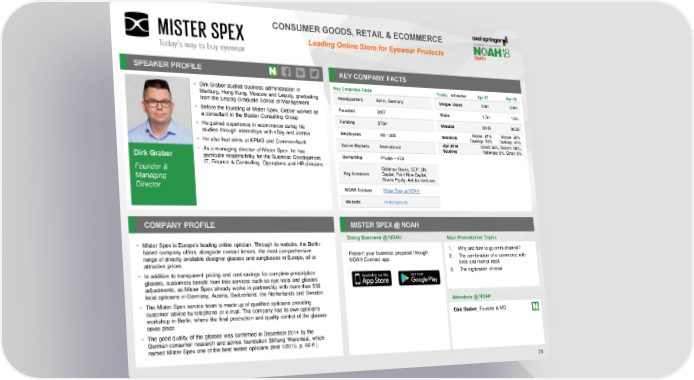 CONSUMER GOODS, RETAIL & ECOMMERCE Leading Online Store for Eyewear Products SPEAKER PROFILE KEY COMPANY FACTS • Dirk Graber studied business administration in Key Corporate Facts Traffic Apr-17 Apr-18 Marburg, Hong Kong, Moscow and Leipzig, graduating Headquarters Berlin, Germany Unique Users 0.9m 0.9m from the Leipzig Graduate School of Management • Before the founding of Mister Spex, Graber worked as Founded 2007 Visits 1.7m 1.6m a consultant in the Boston Consulting Group Funding $70m Minutes 08:45 06:25 • He gained experience in ecommerce during his Mobile: 61% Mobile: 56% studies through internships with eBay and Jamba Employees 100-1,000 Sessions Desktop: 39% Desktop: 44% • He also had stints at KPMG and Commerzbank Active Markets International Apr 2018 Direct: 32%, Search: 56%, • As a managing director of Mister Spex, he has Sources Referrals: 6%, Other: 6% particular responsibility for the Business Development, Ownership Private – VCs Dirk Graber Founder & IT, Finance & Controlling, Operations and HR divisions Goldman Sachs, SEP, DN Key Investors Capital, Point Nine Capital, Managing Grazia Equity, Astutia Ventures Director NOAH Content Mister Spex at NOAH Website misterspex.de COMPANY PROFILE MISTER SPEX @ NOAH Doing Business @ NOAH Main Presentation Topics • Mister Spex is Europe's leading online optician. Through its website, the Berlin- based company offers, alongside contact lenses, the most comprehensive Present your business proposal through 1. Why and how to go omni-channel? range of directly available designer glasses and sunglasses in Europe, all at NOAH Connect app 2. The combination of e-commerce with attractive prices brick-and-mortar retail • In addition to transparent pricing and cost savings for complete prescription 3. The digitization of retail glasses, customers benefit from free services such as eye tests and glasses adjustments, as Mister Spex already works in partnership with more than 500 local opticians in Germany, Austria, Switzerland, the Netherlands and Sweden • The Mister Spex service team is made up of qualified opticians providing Attendees @ NOAH customer advice by telephone or e-mail. The company has its own optician's workshop in Berlin, where the final production and quality control of the glasses Dirk Graber, Founder & MD takes place • The good quality of the glasses was confirmed in December 2014 by the German consumer research and advice foundation Stiftung Warentest, which named Mister Spex one of the best tested opticians (test 1/2015, p. 86 ff.). 78