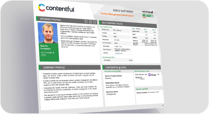B2B & SOFTWARE Content Management Infrastructure SPEAKER PROFILE KEY COMPANY FACTS • Sascha is the CEO and co-founder of Contentful, the Key Corporate Facts Traffic Apr-17 Apr-18 API-driven Content-as-a-service (CaaS) platform, Headquarters Berlin, Germany Unique Users 0.5m 0.3m where he is in charge of strategy development and implementation, business development and investor Founded 2012 Visits 1.0m 0.7m relations • Prior to Contentful, Sascha worked as an IT consultant Funding €38m Minutes 02:40 05:41 Employees 100-1,000 Mobile: 34% Mobile: 35% and in HP's web operations team Sessions Desktop: 66% Desktop: 65% • Sascha grew up in Stuttgart, Germany, and earned his Active Markets Global Apr 2018 Direct: 45%, Search: 27%, Diploma and BS in Business Information Technology Sources Referrals: 21%, Other: 7% from the University of Cooperative Education in his Ownership Private – VCs Sascha home city Benchmark, General Catalyst, Key Investors Konietzke Balderton, Point Nine Co-Founder & Website contentful.com CEO Key Operational KPIs Developers 130,000 COMPANY PROFILE CONTENTFUL @ NOAH Doing Business @ NOAH Main Presentation Topics • Contentful provides content infrastructure for digital teams to power websites, apps, and devices. Unlike a CMS, Contentful was built to integrate with the Panel discussion with and modern software stack Service Providers Interest • It offers a central hub for structured content, powerful management and delivery Marketing APIs, and a customizable web app that enables developers and content creators to ship their products faster Partnerships Interest • Companies like Spotify, Red Bull, Optimizely, Twilio, and Urban Outfitters rely Cloud players in the digital experience on Contentful to solve the complexities of content management in the modern ecosystem (e.g. e-commerce, analytics) multi-channel world Attendees @ NOAH • The demand for a new way to manage content is in the numbers: the company Key Hires Interest is growing rapidly and has raised nearly $50m from VC firms including General VP Engineering Sascha Konietzke, Co-Founder & CEO Catalyst, Benchmark, Balderton, Point Nine, and Trinity Ventures 30