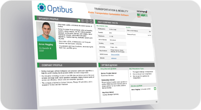 TRANSPORTATION & MOBILITY Public Transportation Optimization Software SPEAKER PROFILE KEY COMPANY FACTS • Amos leads, guides, and directs the overall success of Key Corporate Facts Key KPIs Optibus Headquarters Tel Aviv, Israel Cities on the Platform 300 • During his career Amos architected online ad targeting Founded 2014 systems, search engines, and the Cortana personal Revenue Frowth 3x YoY assistant, for Microsoft, Siemens, and Collarity. Amos’ Employees 51-100 experience includes: optimization and graph algorithms, machine learning, distributed systems and Active Markets International big data • Amos holds a B.Sc. in Mathematics and Computer Science from Ben-Gurion University Funding €14.5m Amos Haggiag • He graduated with Dean Excellence, decorated by the Ownership Private – VCs Co-founder & Wolf, Intel, and Elkin prizes Pitango Ventures, Verizon CEO Key Investors Ventures, Sir Ronald Cohen NOAH Content Optibus at NOAH Website optibus.co COMPANY PROFILE OPTIBUS @ NOAH Doing Business @ NOAH Main Presentation Topics • Optibus leveraged artificial intelligence and advanced optimization algorithms to help the world’s leading transit providers better run mass-transportation 1. The biggest challenge in transportation Service Provider Interest 2. How we disrupt mass transportation • Our disruptive technology is used in over 200 cities and drives some of the most Ecommerce Services complex and large-scale transit operations worldwide, helping improve quality of 3. How we use AI to optimize city service and efficiency, reduce costs and streamline operations transportation • The company is backed by Verizon Ventures, Pitango VC and others, and is Partnerships Interest located in Tel Aviv and San Francisco We are looking for public transit operators or car/bus OEMs that want to be beta users or design partners for new mobility solutions that we develop Attendees @ NOAH Amos Haggiag, Co-founder & CEO Key Hires Interest Country Manager Germany 86