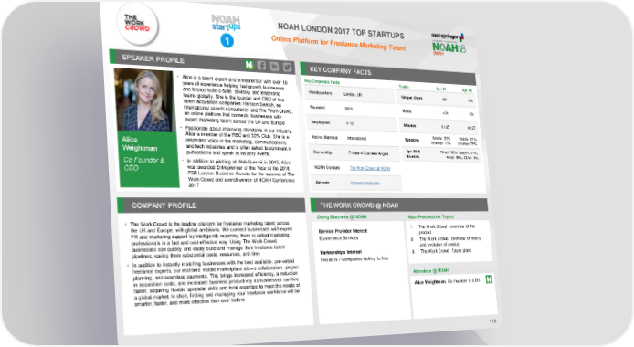 NOAH LONDON 2017 TOP STARTUPS Online Platform for Freelance Marketing Talent 1 SPEAKER PROFILE KEY COMPANY FACTS • Alice is a talent expert and entrepreneur with over 15 Key Corporate Facts Traffic Apr-17 Apr-18 years of experience helping fast-growth businesses Headquarters London, UK Unique Users <5k <5k and brands build c-suite, advisory and leadership teams globally. She is the founder and CEO of two talent acquisition companies:Hanson Search, an Founded 2015 Visits <5k <5k international search consultancy andThe Work Crowd, an online platform that connects businesses with Employees 4-10 Minutes 01:25 01:27 expert marketing talent across the UK and Europe • Passionate about improving standards in our industry, Mobile: 25% Mobile: 21% Alice a member of the REC and 30% Club. She is a Active Markets International Sessions Desktop: 75% Desktop: 79% respected voice in the marketing, communications, Alice and tech industries and is often asked to comment in Apr 2018 Direct: 38%, Search: 21%, Ownership Private – Business Angels Weightman publications and speak at industry events. Sources Email: 38%, Other: 3% Co-Founder & • In addition to pitching at Web Summit in 2015, Alice CEO was awarded Entrepreneur of the Year at the 2016 NOAH Content The Work Crowd at NOAH FSB London Business Awards for the success of The Work Crowd and overall winner of NOAH Conference 2017 Website theworkcrowd.com COMPANY PROFILE THE WORK CROWD @ NOAH Doing Business @ NOAH Main Presentation Topics • The Work Crowd is the leading platform for freelance marketing talent across the UK and Europe, with global ambitions. We connect businesses with expert 1. The Work Crowd - overview of the PR and marketing support by intelligently matching them to vetted marketing Service Provider Interest product professionals in a fast and cost-effective way. Using The Work Crowd, Ecommerce Services 2. The Work Crowd - overview of history businesses can quickly and easily build and manage their freelance talent and evolution of product pipelines, saving them substantial costs, resources, and time Partnerships Interest 3. The Work Crowd - future plans • In addition to instantly matching businesses with the best available, pre-vetted Investors / Companies looking to hire freelance experts, our real-time mobile marketplace allows collaboration, project planning, and seamless payments. This brings increased efficiency, a reduction in acquisition costs, and increased business productivity as businesses can hire Attendees @ NOAH faster, acquiring flexible specialist skills and local expertise to meet the needs of Alice Weightman, Co-Founder & CEO a global market. In short, finding and managing your freelance workforce will be smarter, faster, and more effective than ever before 112