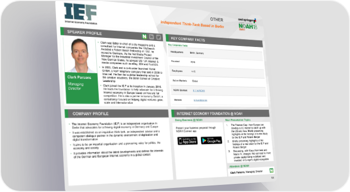 OTHER Independent Think-Tank Based in Berlin SPEAKER PROFILE KEY COMPANY FACTS • Clark was Editor-in-chief of a city magazine and a Key Corporate Facts consultant for Internet companies like CitySearch. Headquarters Berlin, Germany Awarded a Robert Bosch Fellowship in 1997, he moved to Germany. As the first Media Project Manager for the Industrial Investment Council of the Founded 2016 New German States, he advised US / UK Internet & media companies such as eBay, IBM and FoxKIDS. • In 2005, Clark and a co-founder launched Vortel Employees 4-10 GmbH, a VoIP telephony company that sold in 2008 to Inter.net. He then led a global leadership school for the creative industries, the Berlin School of Creative Clark Parsons Leadership Active Markets Global Managing • Clark joined the IE.F at its inception in January 2016. Director He leads the foundation to help advocate for a thriving NOAH Content IE.F at NOAH Internet economy in Europe based on free and fair competition. He is also a partner in iconomy GmbH, a consultancy focused on helping digital ventures grow, Website ie.foundation/en scale and internationalize COMPANY PROFILE INTERNET ECONOMY FOUNDATION @ NOAH Doing Business @ NOAH Main Presentation Topics • The Internet Economy Foundation (IE.F) is an independent organization in 1. The Finance Gap - how Europe can Berlin that advocates for a thriving digital economy in Germany and Europe Present your business proposal through develop a VC market to catch up with • It was established as an inquisitive think tank, an independent advisor and a NOAH Connect app the US and Asia. Briefly presenting competent dialogue partner in the dynamic environment of digitisation and highlights of the findings of a new study digital transformation by the IE.F and Roland Berger • It aims to be an impartial organisation and a pioneering voice for politics, the 2. Briefly presenting highlights of the economy and society findings of a new study by the IE.F and • It provides information about the latest developments and defines the interests Roland Berger of the German and European Internet economy in a global context 3. Discussing, with Klaus Hommels and Marco R., changes that can lead to more private capital being mobilized and invested in Europe's digital ecosystem Attendees @ NOAH Clark Parsons, Managing Director 64