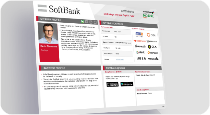 INVESTORS Multi-stage Venture Capital Fund SPEAKER PROFILE KEY INVESTORFACTS • David Thevenon is a Partner at SoftBank Investment Key Corporate Facts Key Portfolio Companies Advisers Headquarters Tokyo, Japan • Prior to SoftBank, he worked at Google as a Senior Director, Global Android Partnerships, where he was heading up the business development teams that Founded 1981 handle partnerships for Android globally • Prior to that he was Google’s Senior Director, Current Fund Size $100bn (SoftBank Vision Fund) International Product Partnerships leading the business development teams that negotiate and manage product enabling partnerships and new business development Employees 100-1,000 David Thevenon for all Google's products (except YouTube and Partner Android) across LATAM, APAC and EMEA Active Markets Global Website softbank.jp/en/ INVESTORPROFILE SOFTBANK @ NOAH Doing Business @ NOAH Main Presentation Topics • At SoftBank Investment Advisers, we seek to catalyze technological progress for the benefit of humanity Present your business proposal through Fireside chat with Marco Rodzynek • Through the SoftBank Vision Fund, we are investing more than $93 billion in the NOAH Connect app businesses and technologies that we believe will enable the next stage of the information revolution • We offer the operational expertise, global network and patient, long-term capital required to help innovators build transformative companies. Attendees @ NOAH David Thevenon, Partner 100