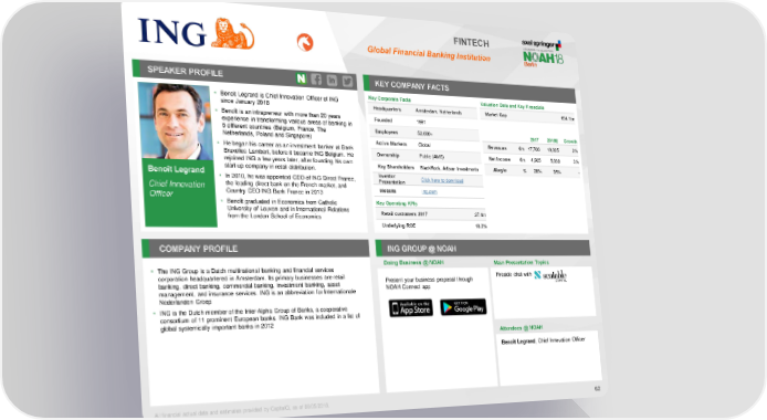 FINTECH Global Financial Banking Institution SPEAKER PROFILE KEY COMPANY FACTS • Benoit Legrand is Chief Innovation Officer of ING Key Corporate Facts Valuation Data and Key Financials since January 2018 Headquarters Amsterdam, Netherlands Market Cap €54.1bn • Benoît is an intrapreneur with more than 20 years Founded 1991 experience in transforming various areas of banking in 5 different countries (Belgium, France, The Employees 52,000+ 2017 2018E Growth Netherlands, Poland and Singapore) Active Markets Global Revenues €m 17,706 18,025 2% • He began his career as an investment banker at Bank Bruxelles Lambert, before it became ING Belgium. He Ownership Public (AMS) Net Income €m 4,905 5,030 3% rejoined ING a few years later, after founding his own Key Shareholders BlackRock, Artisan Investments Margin % 28% 28% - start-up company in retail distribution. Benoît Legrand • In 2010, he was appointed CEO of ING Direct France, Investor Click here to download Chief Innovation the leading direct bank on the French market, and Presentation Officer Country CEO ING Bank France in 2013 Website ing.com • Benoît graduated in Economics from Catholic Key Operating KPIs University of Leuven and in International Relations Retail customers 2017 37.4m from the London School of Economics Underlying ROE 10.2% COMPANY PROFILE ING GROUP @ NOAH Doing Business @ NOAH Main Presentation Topics • The ING Group is a Dutch multinational banking and financial services corporation headquartered in Amsterdam. Its primary businesses are retail Present your business proposal through Fireside chat with banking, direct banking, commercial banking, investment banking, asset NOAH Connect app management, and insurance services. ING is an abbreviation for Internationale Nederlanden Groep • ING is the Dutch member of the Inter-Alpha Group of Banks, a cooperative consortium of 11 prominent European banks. ING Bank was included in a list of global systemically important banks in 2012 Attendees @ NOAH Benoît Legrand, Chief Innovation Officer All financial actual data and estimates provided by CapitaIQ, as of 06/05/2018. 62